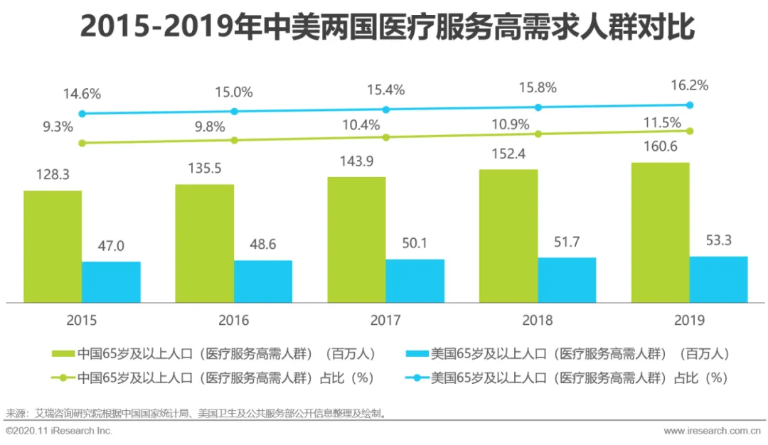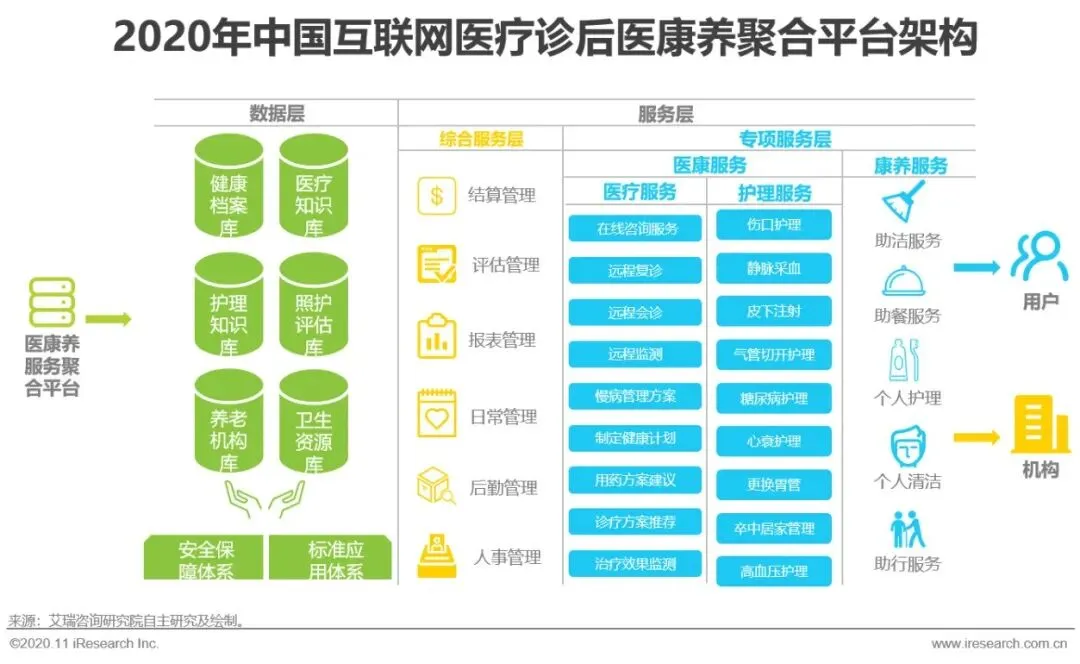 2020年5月,国家医保局推出《关于扩大长期护理保险制度试点的指导意见(征求意见稿)》,决定进一步扩大长护险制度的试点范围,而推进医康与康养的深度融合正是符合规划要求的方向之一。随着中国医疗技术水平不断发展,群众对于医疗、康复、养老的需求日益增加,除患病、失能人群外,慢病、亚健康人群也亟需医康养服务。艾瑞认为,互联网赋能的医疗服务、护理服务、康养服务的医康养结合平台,未来将有很大概率在全国范围内推动并实行,并助力中国医疗大健康整体政策的落地。