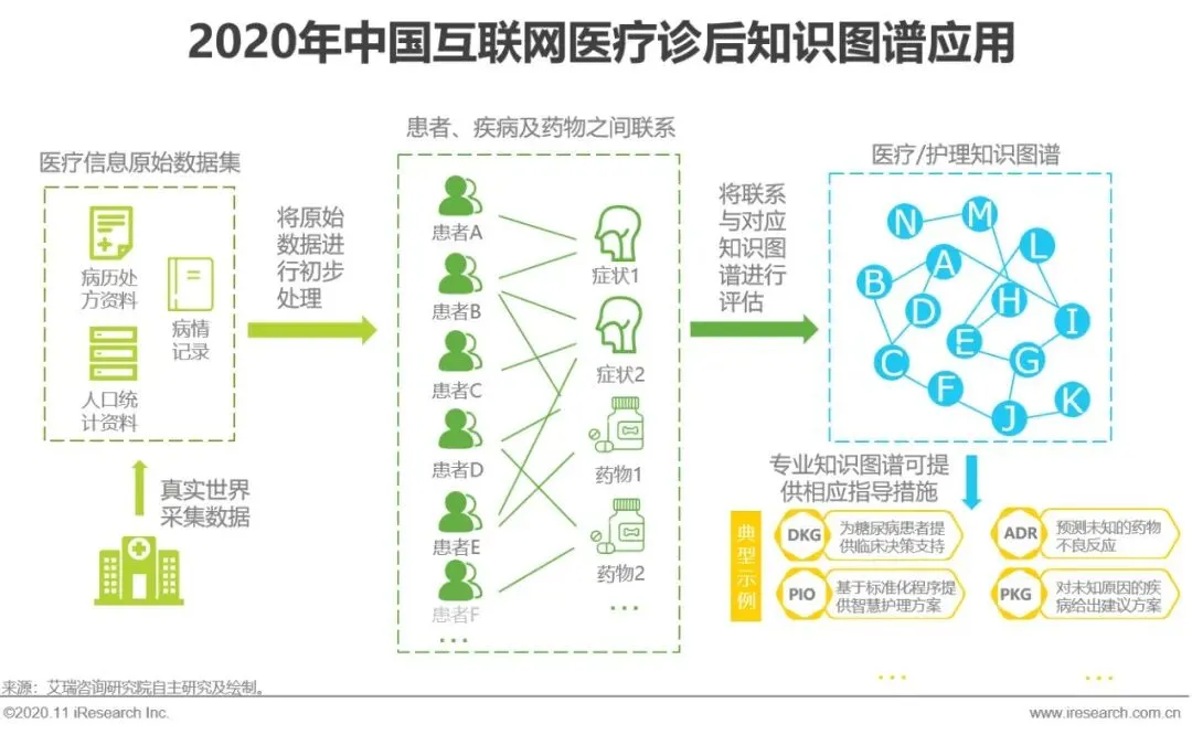 目前的知识图谱构建主要是从医疗大数据或标准指南中拆解分析得到。分析的过程包括构建、规范化、存储、管理和挖掘,通过对比真实世界数据与知识图谱,可有效提高医疗效率,减少医疗不良事件的发生。国内外典型的诊后知识图谱包括为糖尿病患者提供计算机化临床决策支持的DKG图谱;融合了包括CCC、NNN、interRAI等国际护理标准知识库,形成的智慧护理标准化程序的PIO图谱;用于预测未知的药物不良反应的ADR图谱;用于儿科疾病预测的儿科混合知识图谱等。