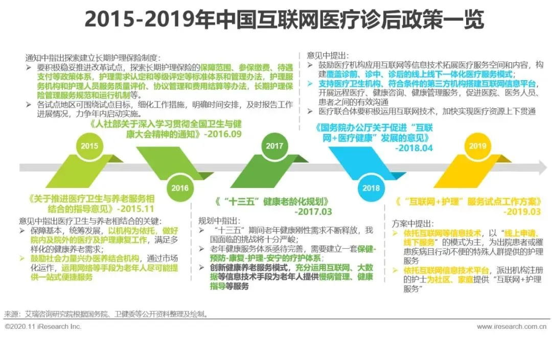 政府对于互联网医疗服务的监管政策一贯较为严格。由于互联网可能会使医疗责任的界定变得较为模糊,因此相关政策也会更为谨慎。但诊后康复护理及慢病管理多为老年人需求,且政府希望能够借助社会力量减轻由老龄化加剧带来的压力,因此诊后相关的医疗活动得到了政府的大力支持,从2015年至今,政府不断鼓励以线下医疗或非医疗机构为依托,做好院内院外的医养结合工作。随着近年来互联网、云计算等技术的兴起,政府也越来越重视依托互联网平台去辅助诊后相关工作,并于2019年专门提出“互联网+护理”的试点工作方案,推动互联网医疗诊后的进一步发展。