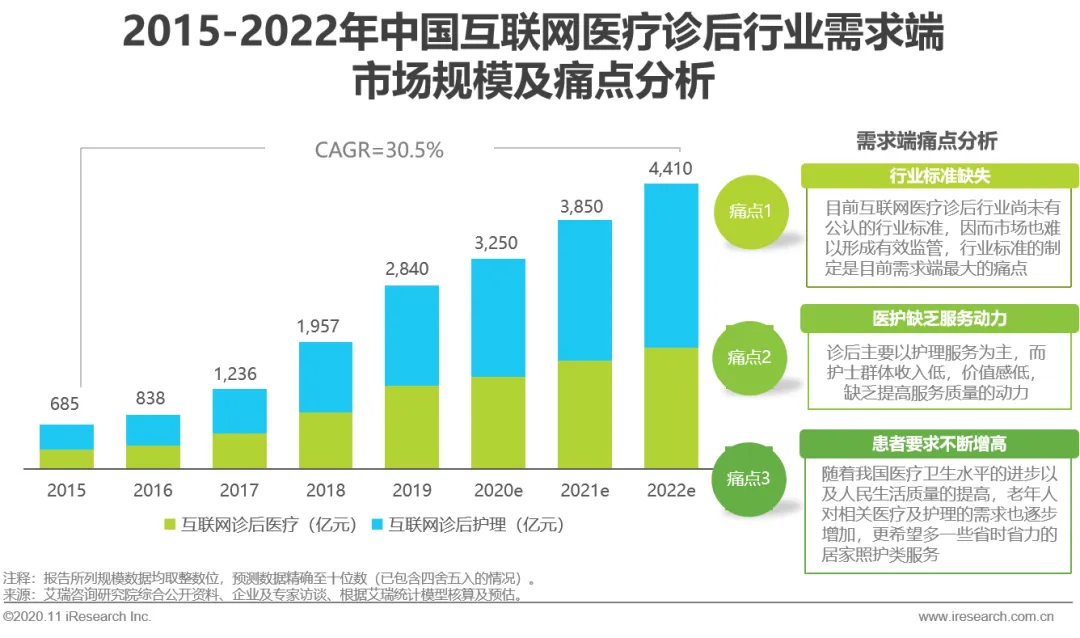 随着我国医疗卫生水平不断提高,越来越多的慢性病人群开始知晓并重视自身所得疾病,并因此使线上医疗诊后需求不断增加。根据艾瑞测算,诊后医疗及护理的线上渗透率不断提高,从2015年渗透率不足5%,至2019年已达到8.5%。预计2019年整个行业需求端规模已高达2,840亿元,预计2020年行业需求端规模将突破3000亿元。目前行业存在的痛点主要包括行业标准缺失、医护缺乏服务动力以及患者要求不断增高。其中行业标准的缺失会导致各企业既是“裁判员”又是“运动员”,长远来看并不利于行业发展。目前行业亟需能够有实力、有G端资源的企业协助政府去制定赛道内的统一标准规范。