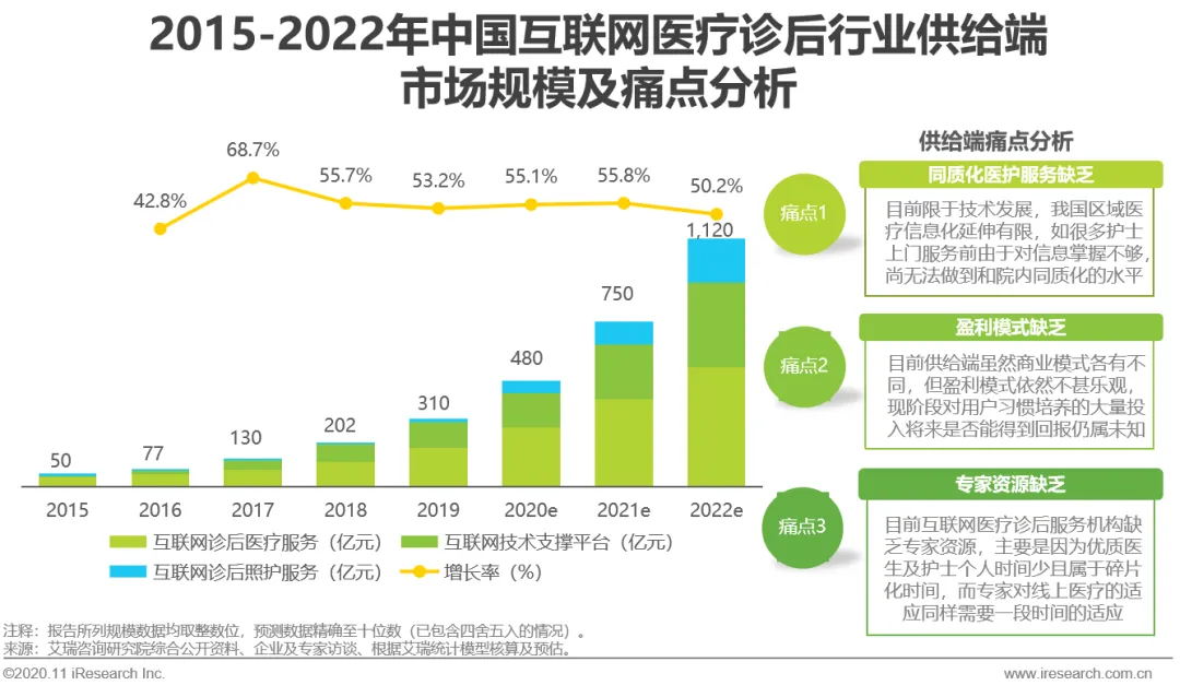 从治疗到康复的流程一直以来就是医疗的重点内容。每种疾病在经过治疗后,预后、并发症、生存周期等都需要继续了解和关注,治疗带给患者的利弊,也需要长久的随访。但一直以来,线下诊后面临诸多难题如:1)由于患者依从性差造成的复诊难题;2)传统模式下患者的长期随访和指导治疗在目前的医疗体系中很难实现;3)患者因药就医、用药指导等难题。互联网技术赋能的医疗诊后行业作为一个独立赛道,可以协助线下传统模式在院内的信息共享,院外的处方外延、复诊管理及诊后照护等方面不断拓展创新,帮助解决应对线下诊后管理日渐突出的现实问题。
