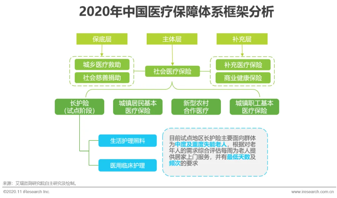 国家医保与商保健康险是目前我国社会保障体系下两种基本的医疗保障方式。其中医保作为主要保障手段及支付方,在推动社会保障事业发展中起到关键作用。目前医保包括的主要内容有城镇居民基本医疗保险、新型农村合作医疗、城镇职工基本医疗保险及正在试点的长护险。目前长护险处于小步快跑的试点阶段,2020年5月,国家医保局推出了《关于扩大长期护理保险制度试点的指导意见(征求意见稿)》。艾瑞认为,未来长护险将会逐步推广,并能有效覆盖医疗诊后护理康复部分,与医保、商保一道为老年人及失能人群支付诊后医康养的费用,有效降低该群体的医康养自费压力。