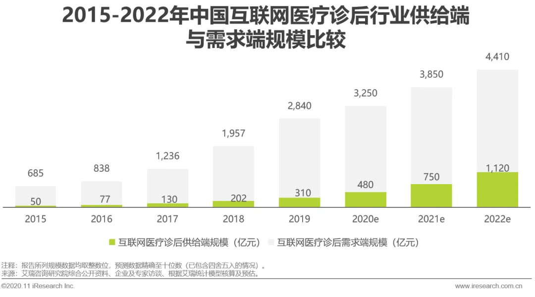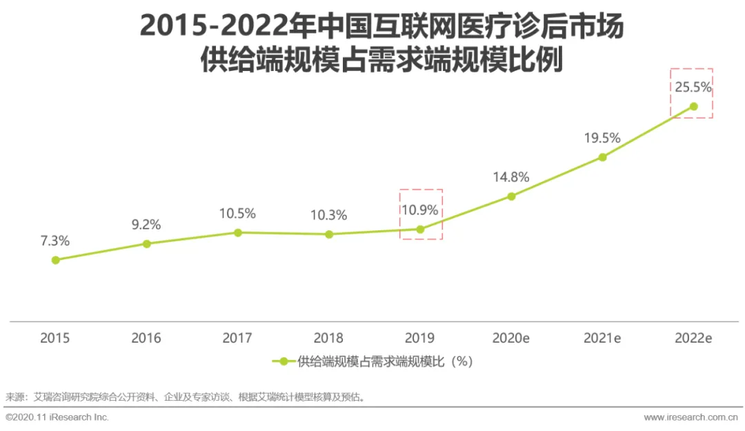 由于过去几年整体医疗大环境仍较为保守,医保支付、处方药线上购买等尚不明确,再加之移动端诊后管理技术有限,共同导致了盈利模式的长期不明晰,使得市场上供求方缺乏动力。根据艾瑞推算,2019年互联网医疗诊后市场供给端仅占需求端规模的1/10左右。但是,随着2020年多项政策的出台及国家医疗大战略方向的明晰,以及疫情对于互联网医疗诊后的推动,使得互联网赋能医疗诊后在便捷、高效、提高服务可及性以及优化资源配置等方面的优势愈加明显,需求的井喷也将刺激并加速供给端市场快速拓展。根据艾瑞推算,至2022年互联网医疗诊后供给端规模将提升至需求端规模的1/4左右。