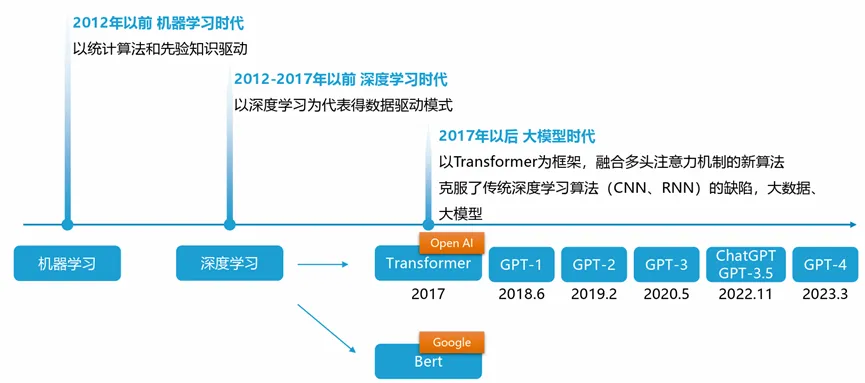 自“人工智能”概念首次提出,历经逻辑推理、专家系统、深度学习等技术,经过数十年发展,从深度学习过渡到大模型时代,以Transformer为框架,融合多头注意力机制的新算法,克服了传统深度学习算法(CNN、RNN)的缺陷,为人工智能带来里程碑式的进步。