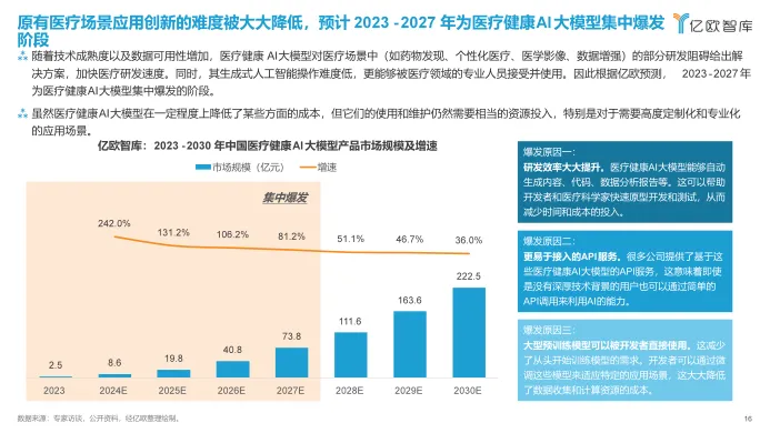 随着技术成熟度以及数据可用性增加,医疗健康AI大模型对医疗场景中(如药物发现、个性化医疗、医学影像、数据增强)的部分研发阻碍给出解决方案,加快医疗研发速度。同时,其生成式人工智能操作难度低,更能够被医疗领域的专业人员接受并使用。因此根据亿欧预测,2023-2027年为医疗健康AI大模型集中爆发的阶段。