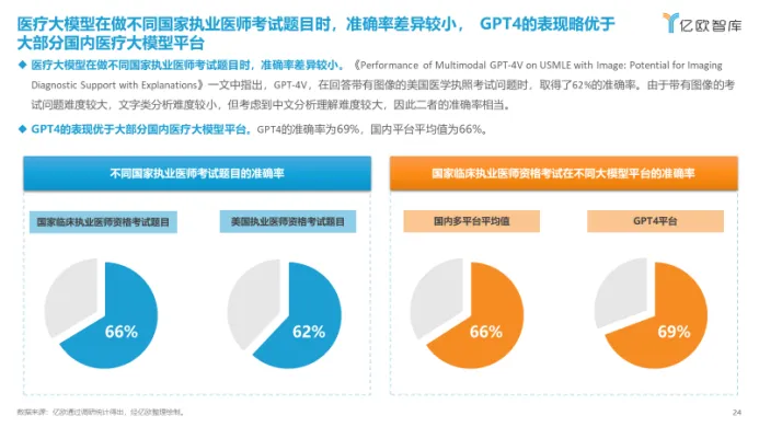 医疗大模型在做不同国家执业医师考试题目时,准确率差异较小。GPT4的表现优于大部分国内医疗大模型平台。GPT4的准确率为69%,国内平台平均值为66%。