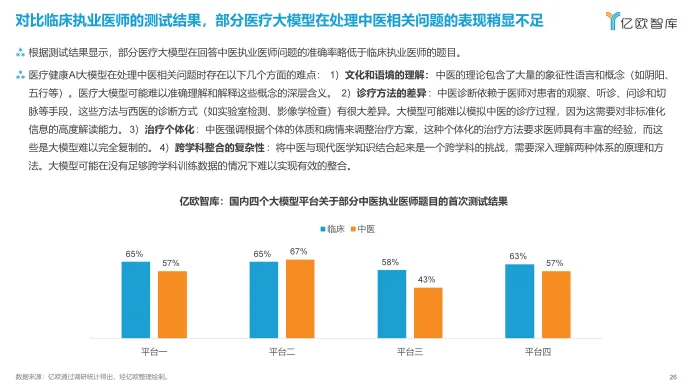 对比临床执业医师的测试结果,部分医疗大模型在处理中医相关问题的表现稍显不足。医疗健康AI大模型在处理中医相关问题时存在以下几个方面的难点: