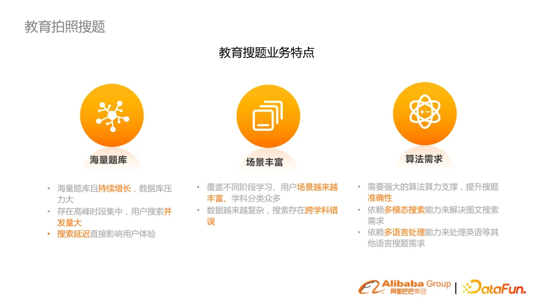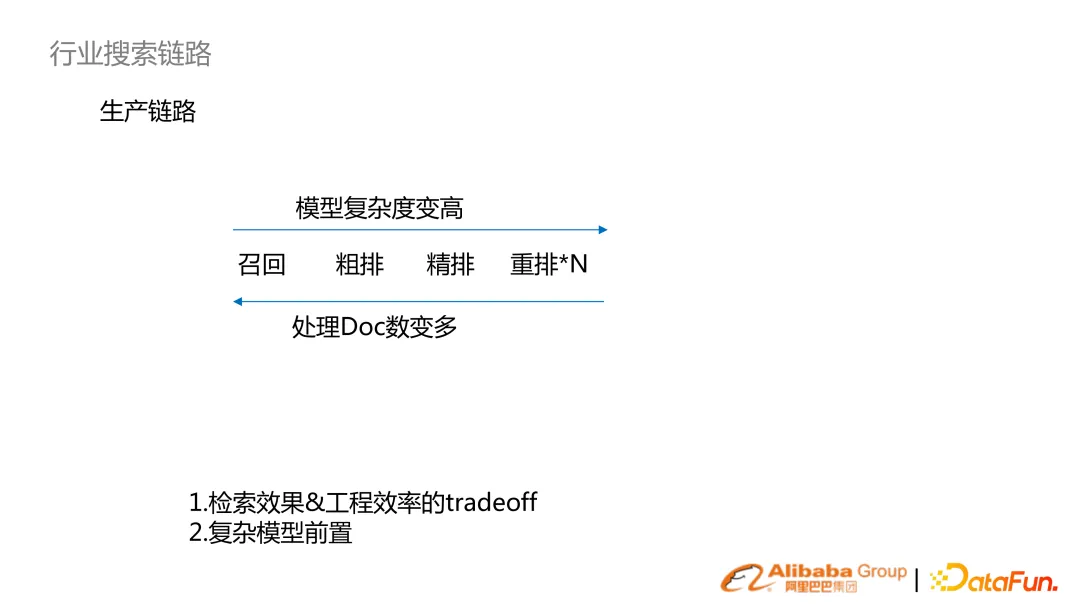 用户群体和 UV:消费互联网搜索 UV 非常大,产业互联网面向政企内部的员工; 搜索追求指标:消费互联网,除了追求搜得到、搜得准之外,还追求转化率高。在产业互联网,它更多是信息匹配的需求,所以关注召回跟相关性; 工程系统要求:消费互联网 QPS 的要求会很高,沉淀大量的用户行为,需要有实时日志分析、实时模型训练。产业互联网的要求会低一些; 算法方向:消费互联网会从 offline、nearline、online 的海量用户行为分析建模获得更大收益。产业互联网的用户行为稀疏,所以会更注重内容理解,比如 NLP 或者视觉的理解,研究方向包括 low resource、transfer learning。