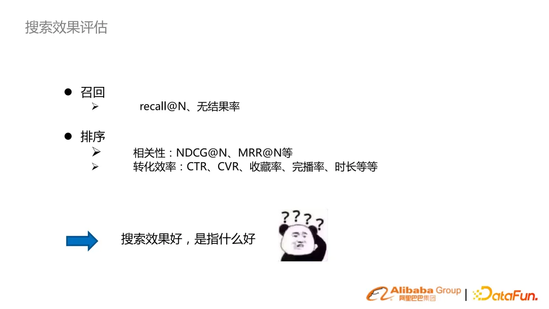 召回:recall 或无结果率 排序:相关性、转化效率(贴近业务) 相关性:NDCG、MRR 转化效率:点击率、转化率