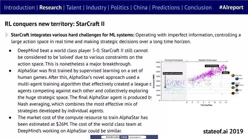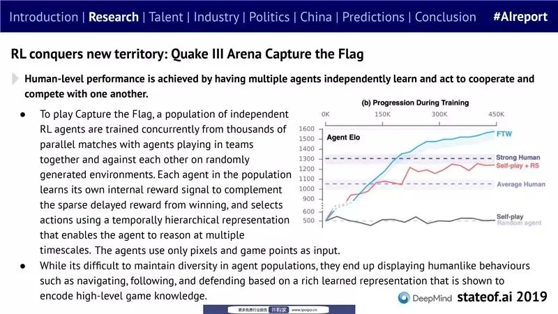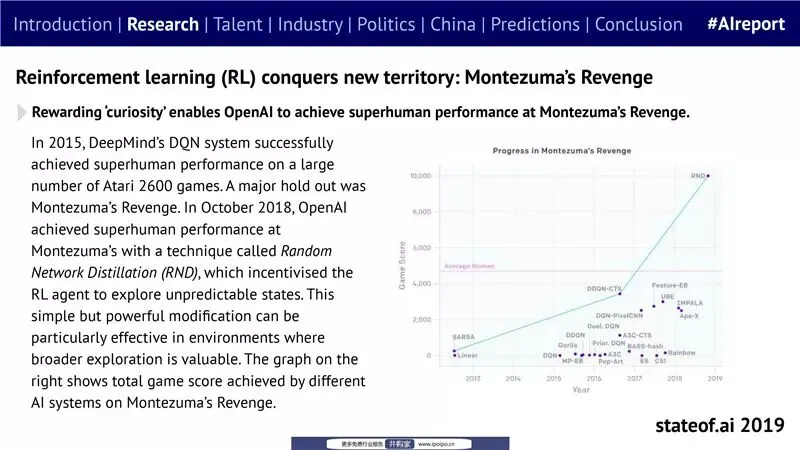 增强学习技术已在多个游戏中取得大幅进步,包括《蒙特祖玛的复仇》、 《星际争霸2》、《雷神之锤3》。在《蒙特祖玛的复仇》中,AI应用最新的随机网络蒸馏技术( RandomNetwork Distillation (RND) )已经取得了10000分的超高分;在《星际争霸2》中Deepmind以5:0的比分战胜了世界级人类选手。Open AI的dota2选手现在已经进行了超过7000场与人类对决的游戏,并取得了99.4%的胜率。