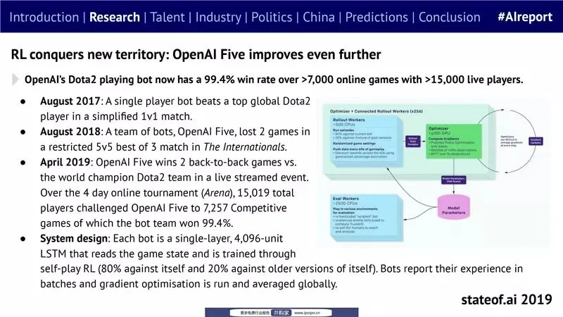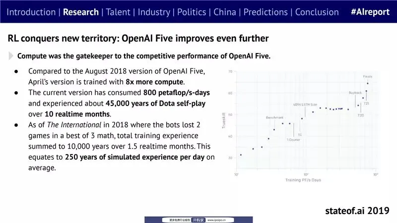 相比于去年的版本,OpenAI 有了超过八倍的训练量,Dota项目已经相当于人类打了45000年的游戏。