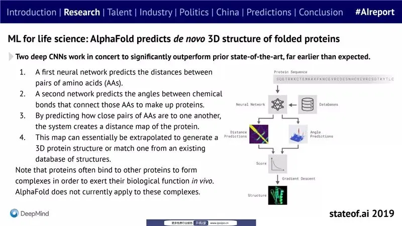 机器学习技术在生命科学也取得了重大突破:AlphaFold预测出了折叠蛋白的三维结构。