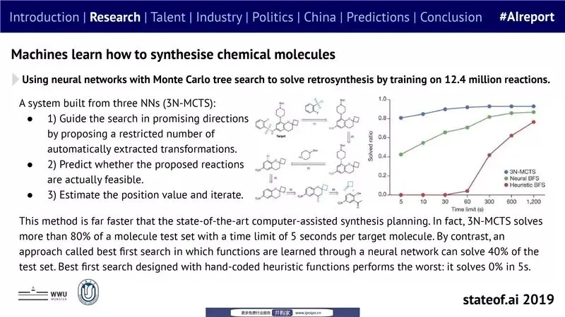 机器现在可以学习如何合成化学分子,利用神经网络与蒙特卡罗树搜索相结合,通过对1240万个反应的训练来解决反合成问题。