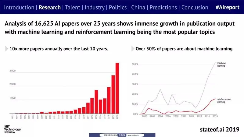 对16625篇人工智能论文的分析表明,在过去25年里,随着机器学习和强化学习成为最受欢迎的话题,人工智能论文的出版数量出现了巨大的增长。