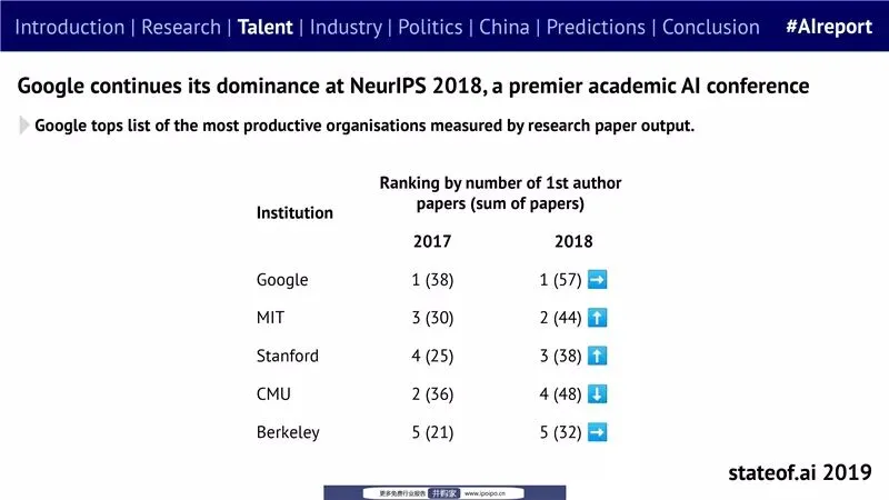谷歌继续保持领先地位,在AI顶级会议 NeurIPS 上的论文最多。