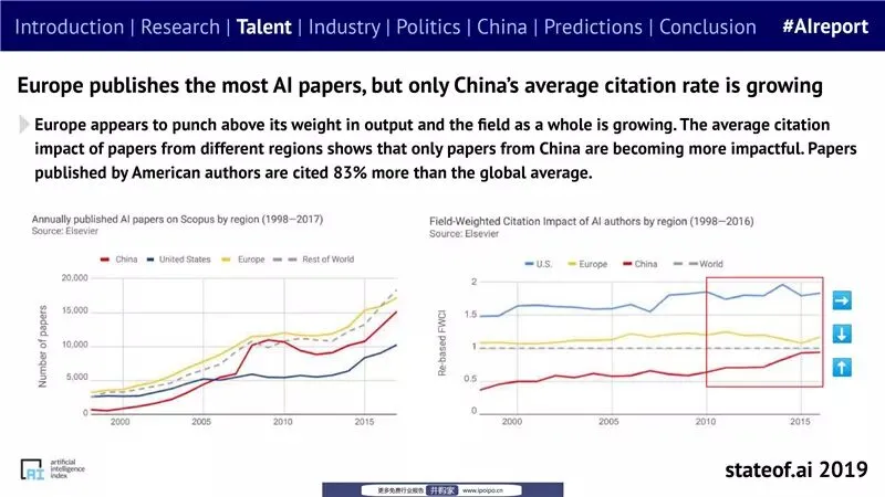 欧洲发表的人工智能论文最多,但只有中国的平均引文率在增长。欧洲的产量似乎超过了其所占比重。分析不同地区论文的平均被引率表明,只有来自中国的论文才引用率在增长。美国作者发表的论文被引用的次数比全球平均水平高出83%。