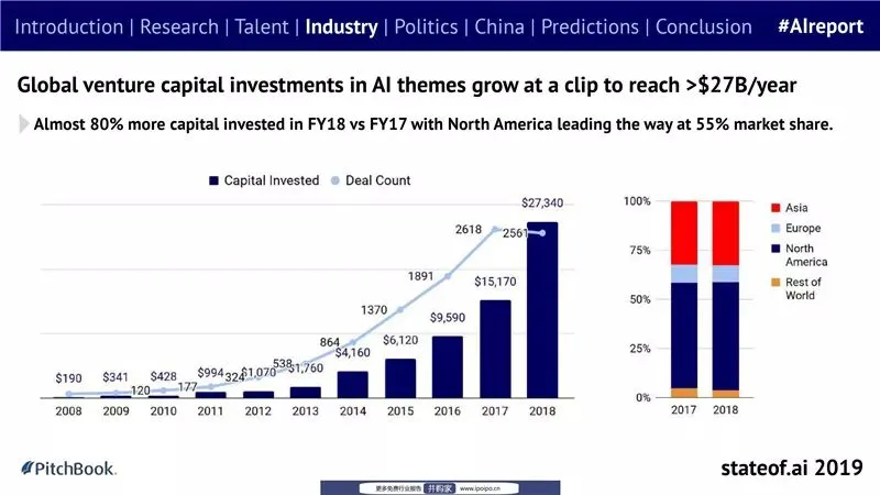 人工智能相关的全球风险投资以每年270亿美元的速度增长。在17财年和18财年,投资资本增加了近80%,其中北美市场份额最高,达到55%。
