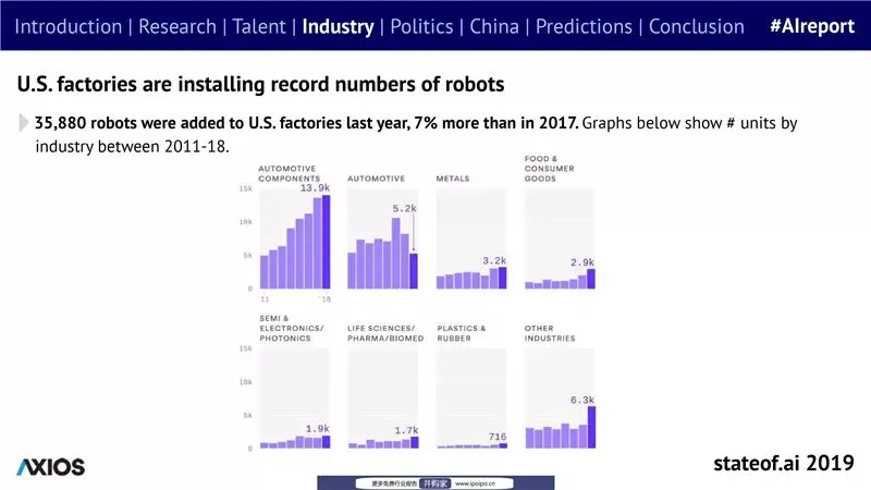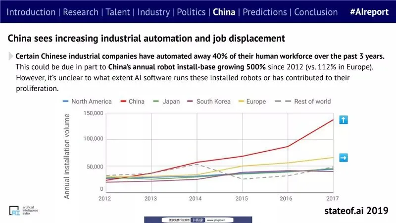 中国的工业自动化和工作岗位的转移正在增加,在过去的三年里,一些中国的工业企业已经使其40%的劳动力自动化。这可能部分是因为自2012年以来,中国每年的机器人安装数量增长了500%(欧洲为112%)。然而,目前还不清楚这些安装的机器人上多大程度上运行人工智能软在,或者在多大程度上促进了它们的增长。