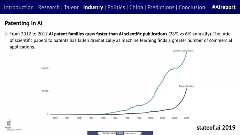 从2012年到2017年,人工智能专利的增长速度超过了人工智能科学出版物(28%对6%)。随着机器学习发现更多的商业应用,科学论文与专利的比例大幅下降。