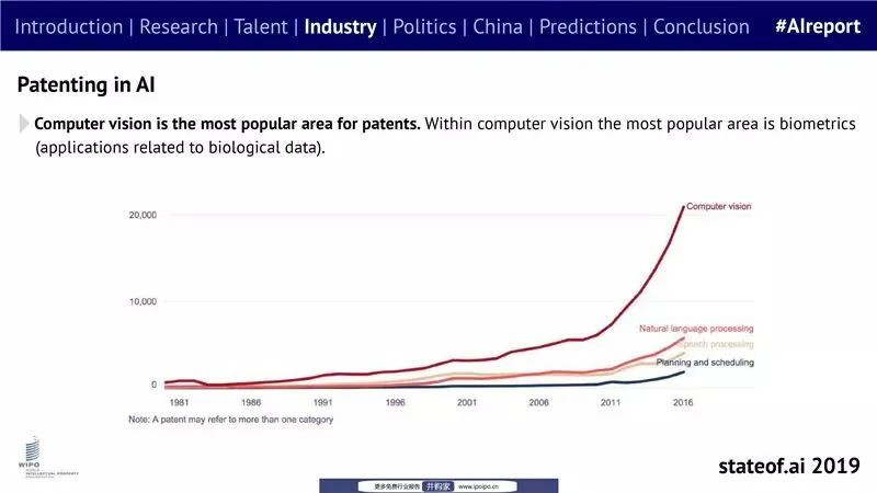 计算机视觉是最受欢迎的专利领域。在计算机视觉中,最受欢迎的领域是生物统计学(与生物数据相关的应用)。
