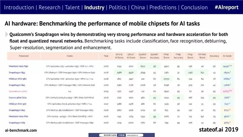 人工智能硬件:高通的骁龙处理器通过为浮点和量化神经网络展示非常强大的性能和硬件加速赢得了胜利。基准测试任务包括分类、人脸识别、去模糊、超分辨率、分割和增强。