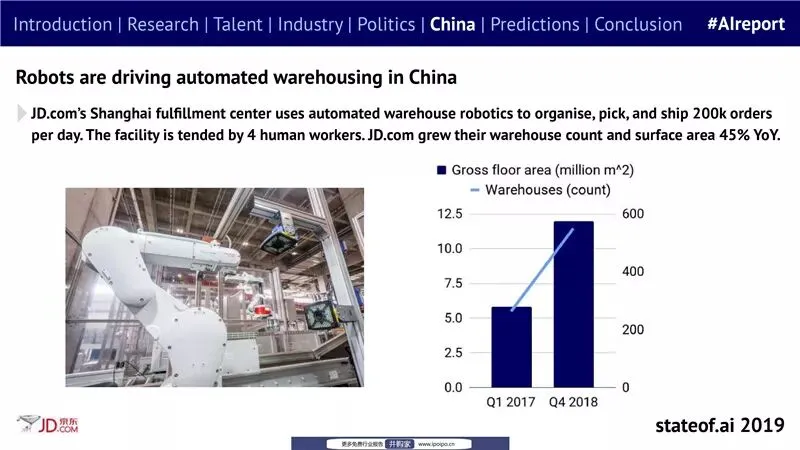 在中国,机器人正在推动自动化仓储。京东上海配送中心每天使用自动化仓库机器人组织、挑选和运送20万份订单。这个设施由四名工人照管。京东的仓库数量和表面积同比增长45%。