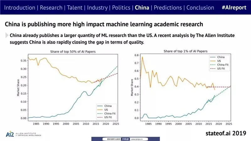 中国最近发表了许多有影响力的机器学习学术研究成果。中国发表的ML研究论文数量已经超过了美国。艾伦研究所(Allen Institute)最近的一项分析显示,中国在质量方面的差距也在迅速缩小。