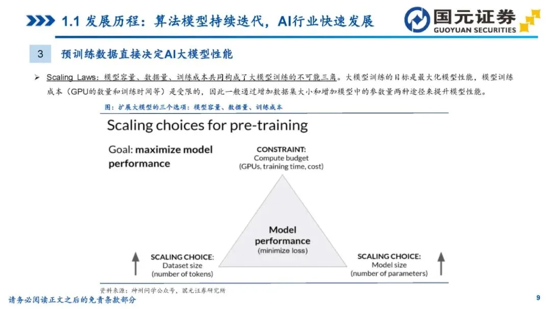 ScalingLaws:模型容量、数据量、训练成本共同构成了大模型训练的不可能三角。大模型训练的目标是最大化模型性能,模型训练成本(GPU的数量和训练时间等)是受限的,因此一般通过增加数据集大小和增加模型中的参数量两种途径来提升模型性能。