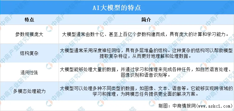 目前,AI大模型具有参数规模庞大、结构复杂、通用性强、多模态处理能力等特点。