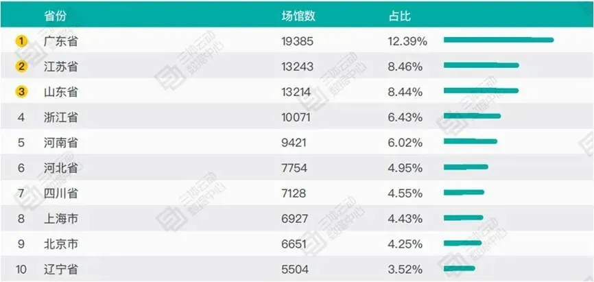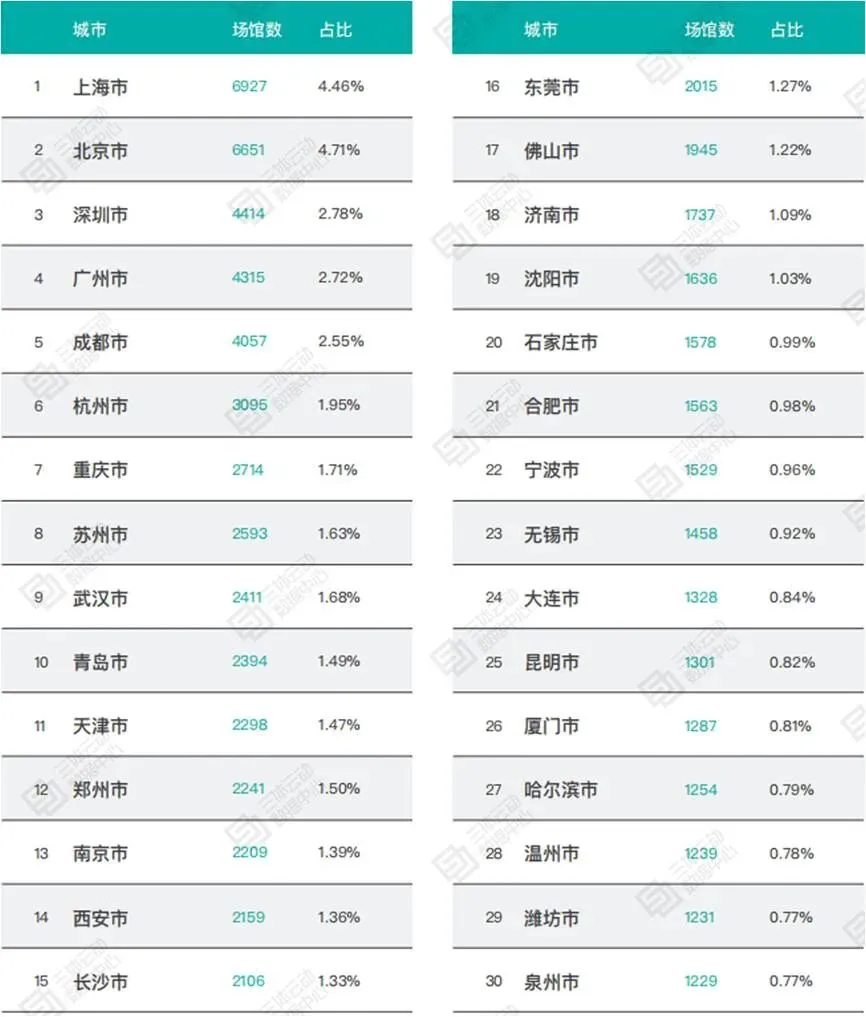 另外,帮助广东省挤进省份排行榜Top1贡献最大的城市依次为深圳、广州、东莞和佛山,合计12689家场馆,全国占比7.99%。广东也是唯一一个超过四个城市同时进入Top30榜单的省份,其它超过三个城市同时上榜的省份有浙江、江苏和山东。