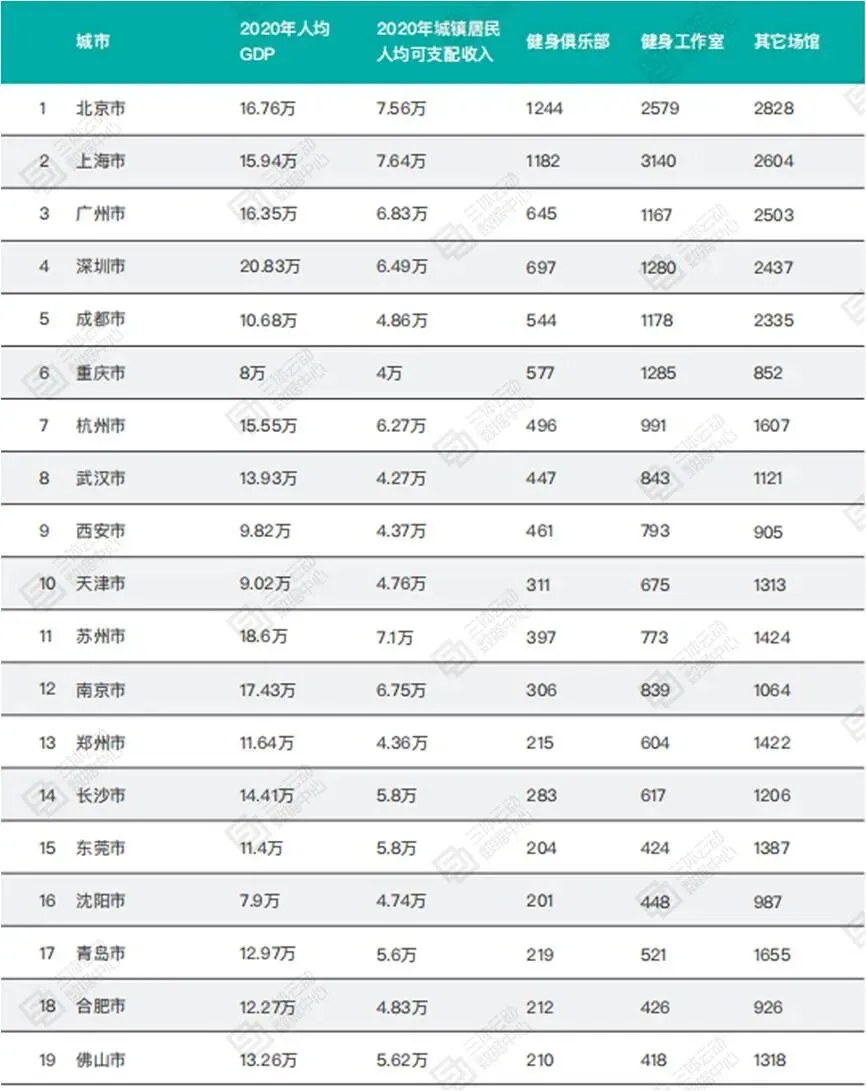 由此,我们可以认为城镇人均可支配收入高,但商业健身房(含俱乐部和工作室)数量相对较少的城市,可作为健身房投资开店的重要参考依据之一,比如苏州、南京、东莞、佛山等,预测这些城市的健身市场有着更大的发展潜力和上升空间。相反,城镇人均可支配收入低但商业健身房数量较多的城市,其健身市场则相对较为饱和,如成都、重庆、天津等。