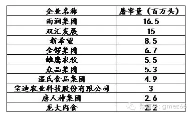 表1 中国主要生猪屠宰加工企业排名及年屠宰量
