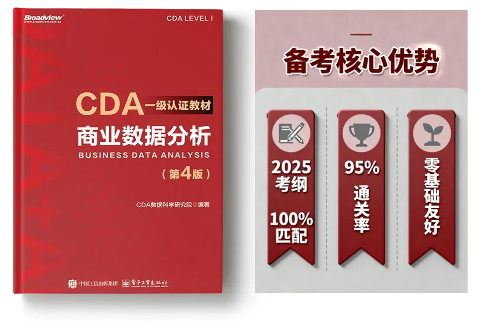 2025 CDA 一级考纲悄然更新,对着密密麻麻的考点不知从何下手?零基础想入门数据分析,翻了一堆资料却越学越混乱?身为业务运营,想靠数据优化决策,却始终缺一套系统方法?别急!CDA 一级官方指定教材 ——《商业数据分析(2025)》重磅来袭!考纲全覆盖、7 周计划带学、实战案例同步企业需求,不管你是冲刺认证、职场入门还是能力升级,这本 “数据红宝书” 都能帮你少走 80% 的弯路!现在登录 CDA 平台,即可免费领取教材试读权限 + 专属学习大礼包!