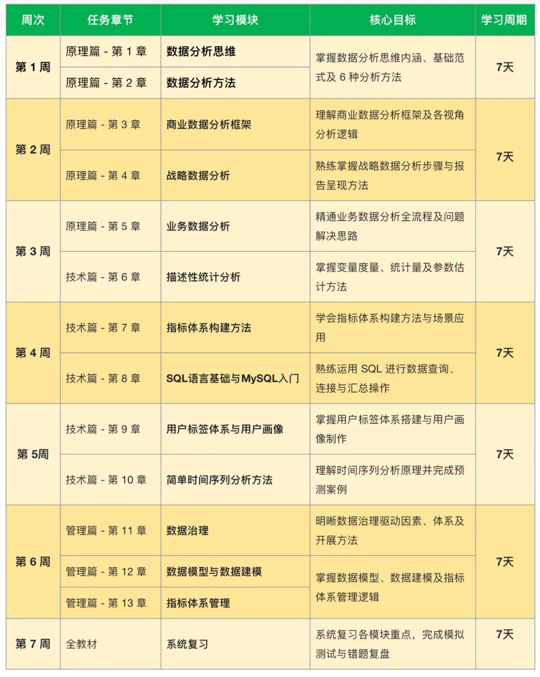 针对在职考生、零基础人群量身打造 7 周备考计划,每周明确学习任务、核心目标与教材章节强绑定:第 1-2 周打基础(教材第 1-5 章原理篇),第 3-4 周攻技术(第 6-10 章 SQL / 统计),第 5-7 周练实战(第 11-13 章管理篇)。每天仅需 1 小时,跟着计划循序渐进,轻松实现 “从 0 到通关” 的跨越!