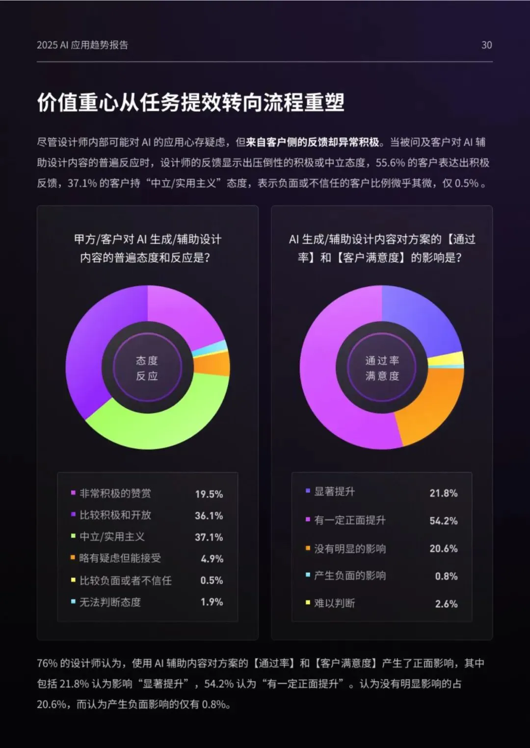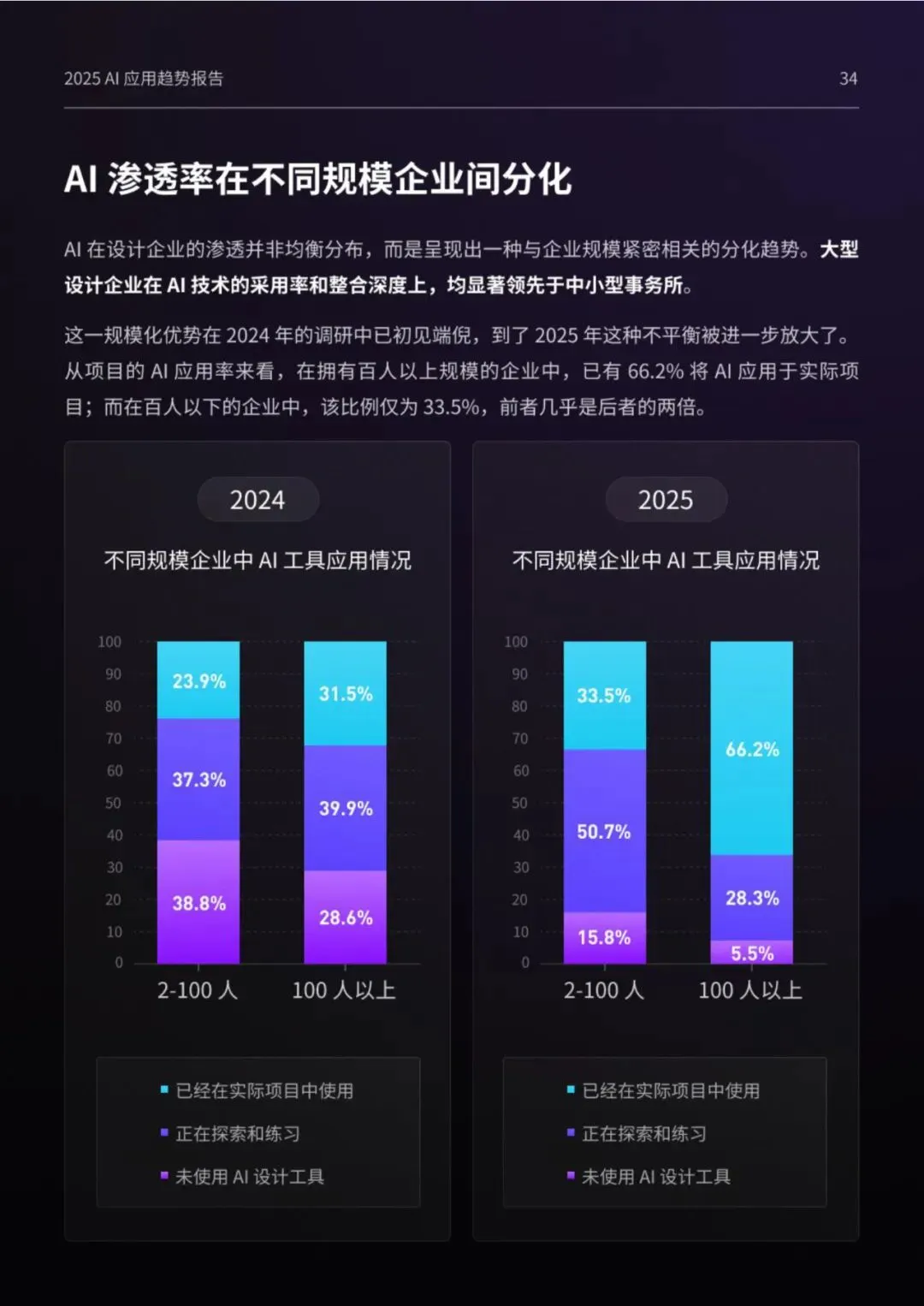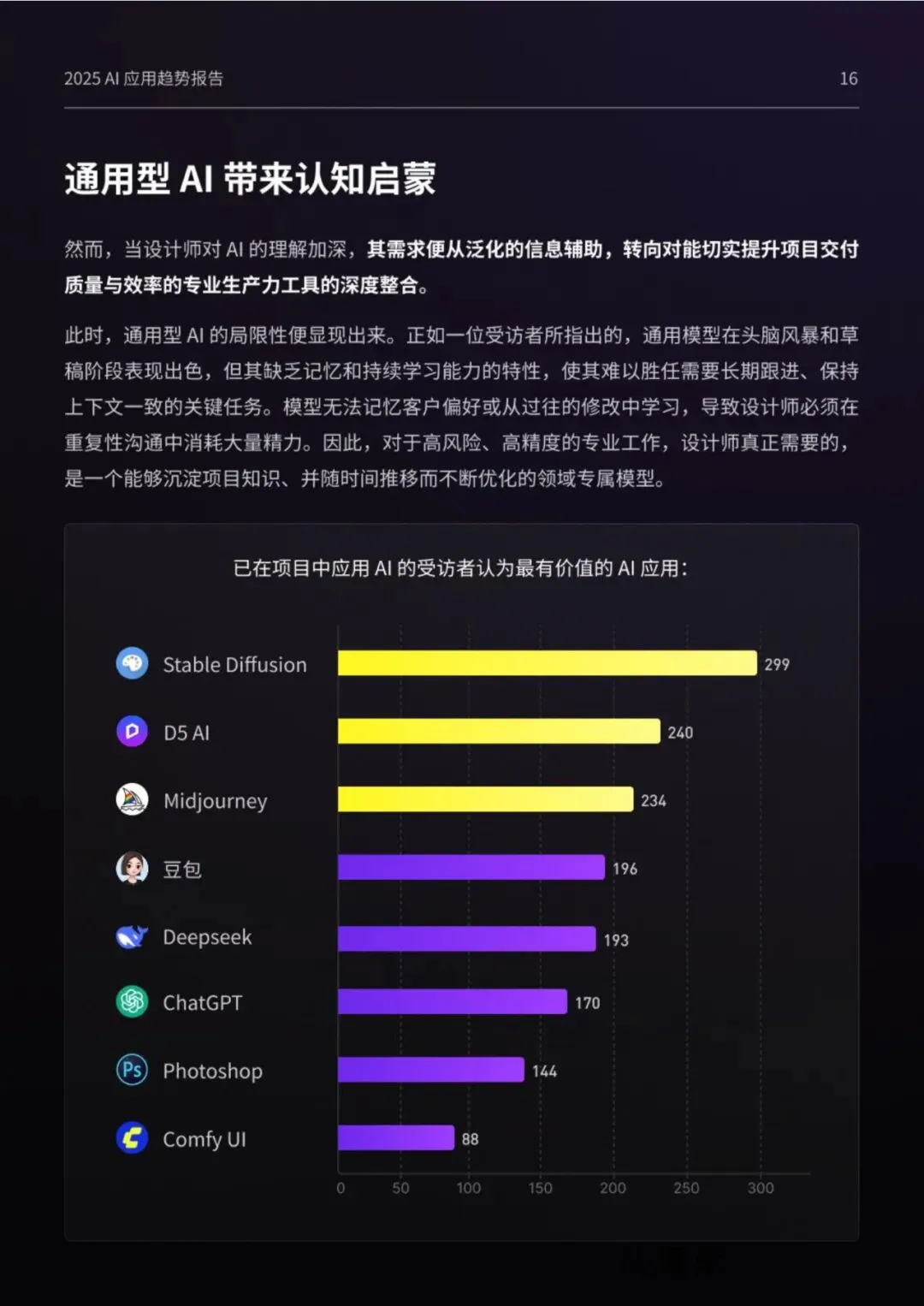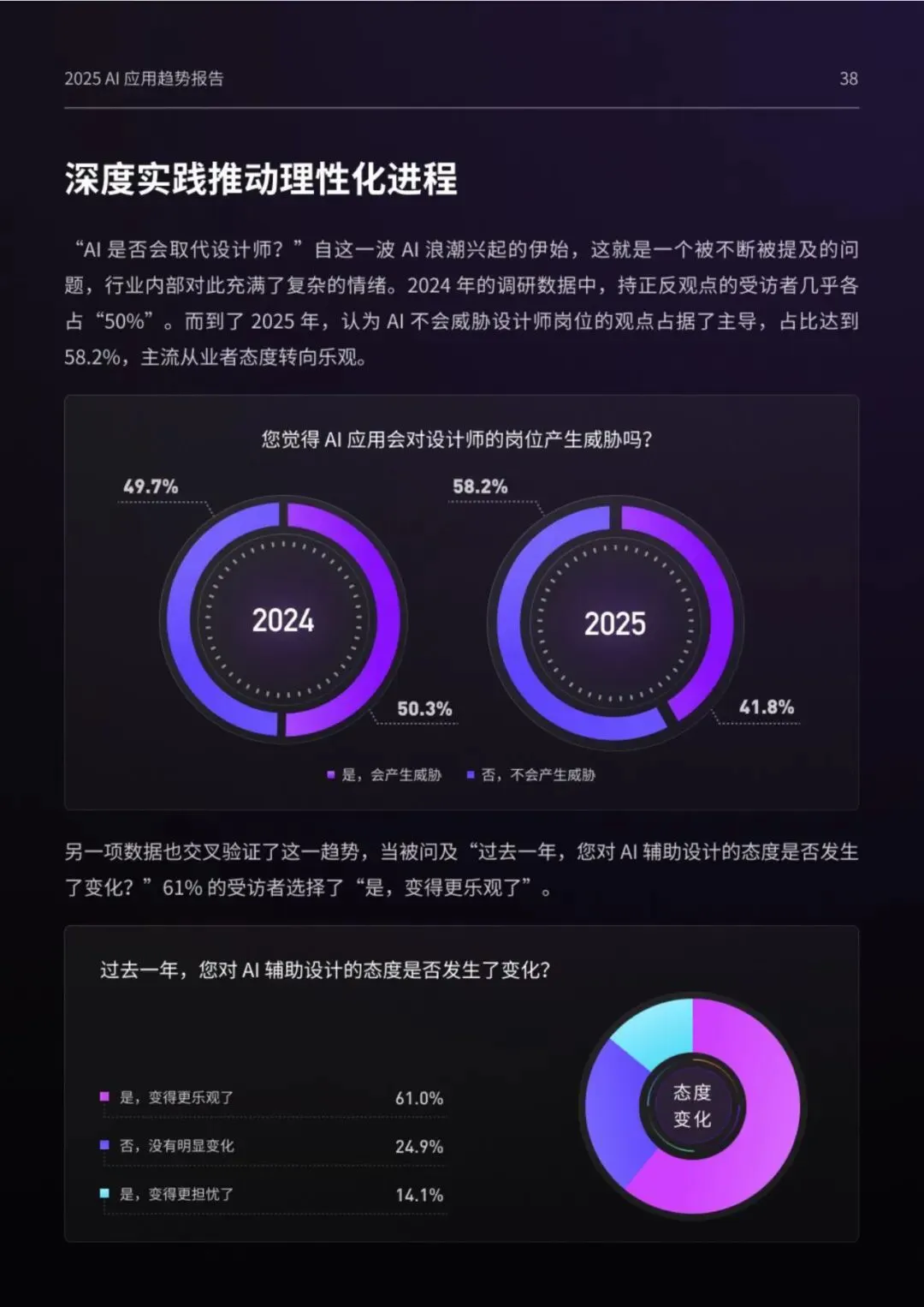 2025年AI在设计行业的使用率已达85.8%,其中43.8%的受访者已在项目中使用AI辅助设计,42%正在探索学习,仅14.2%未使用任何AI工具。与2024年相比,AI应用格局发生根本性变化,用户基数快速增长,应用深度显著加强。