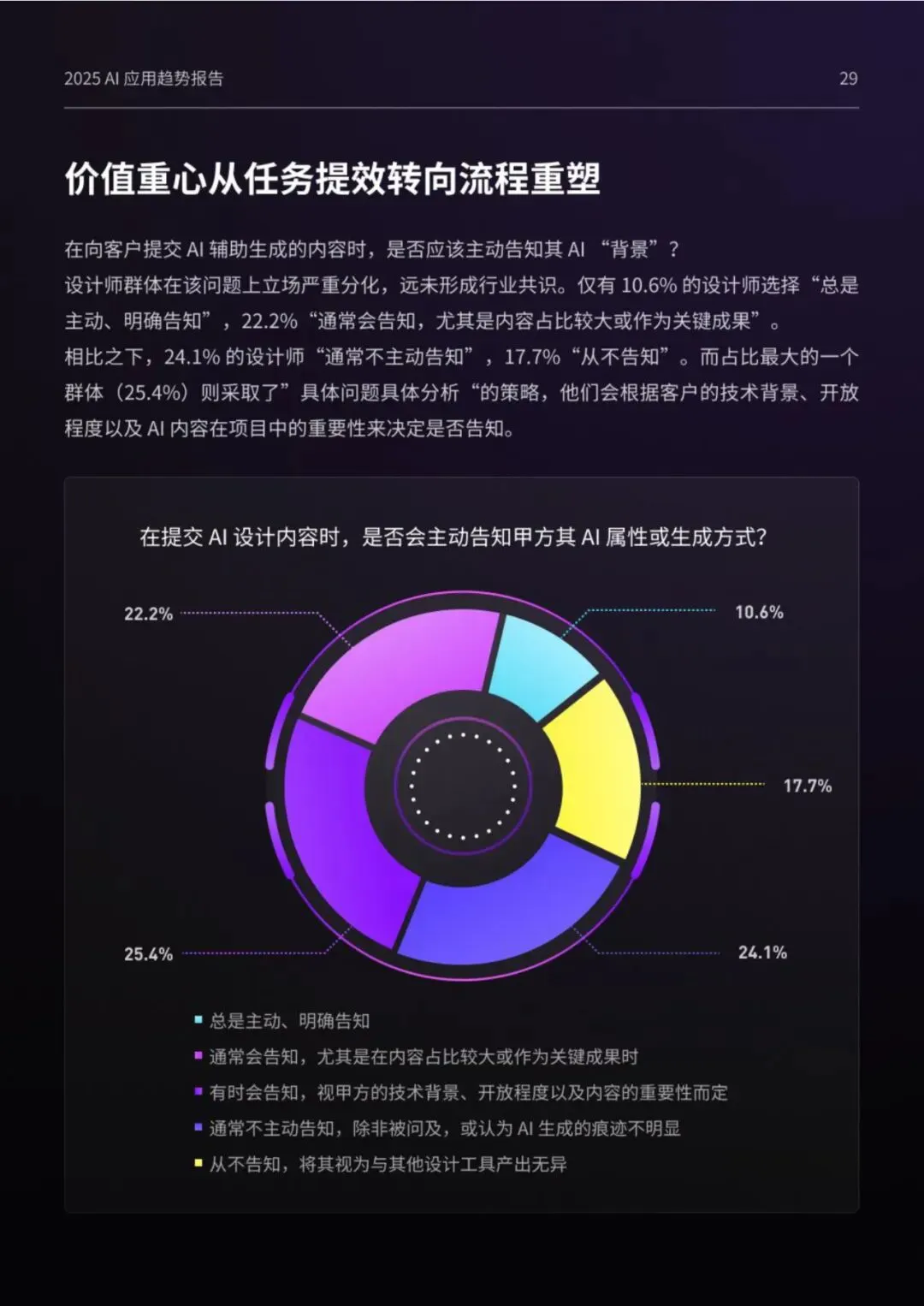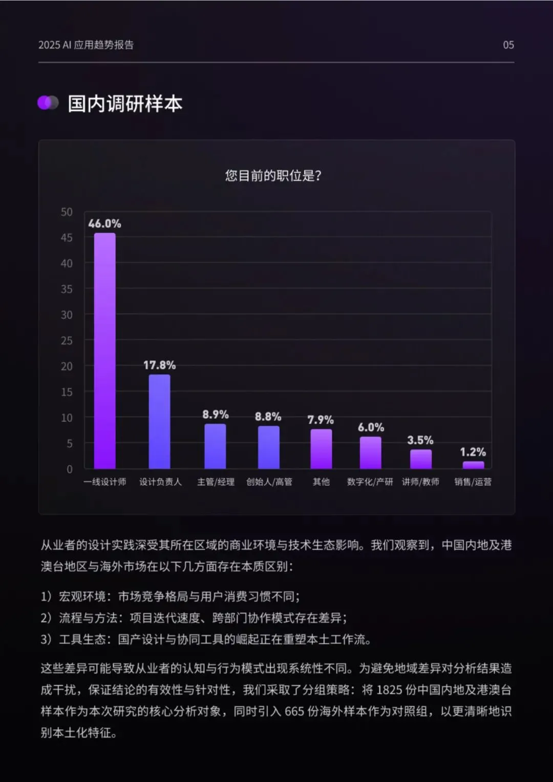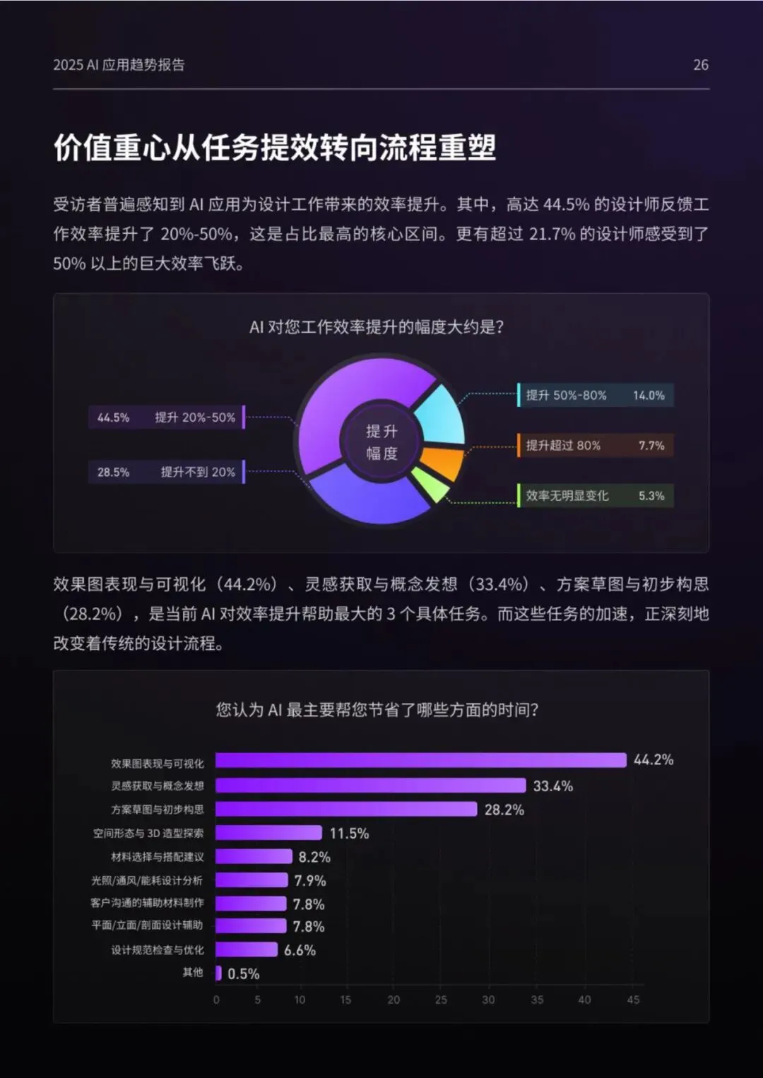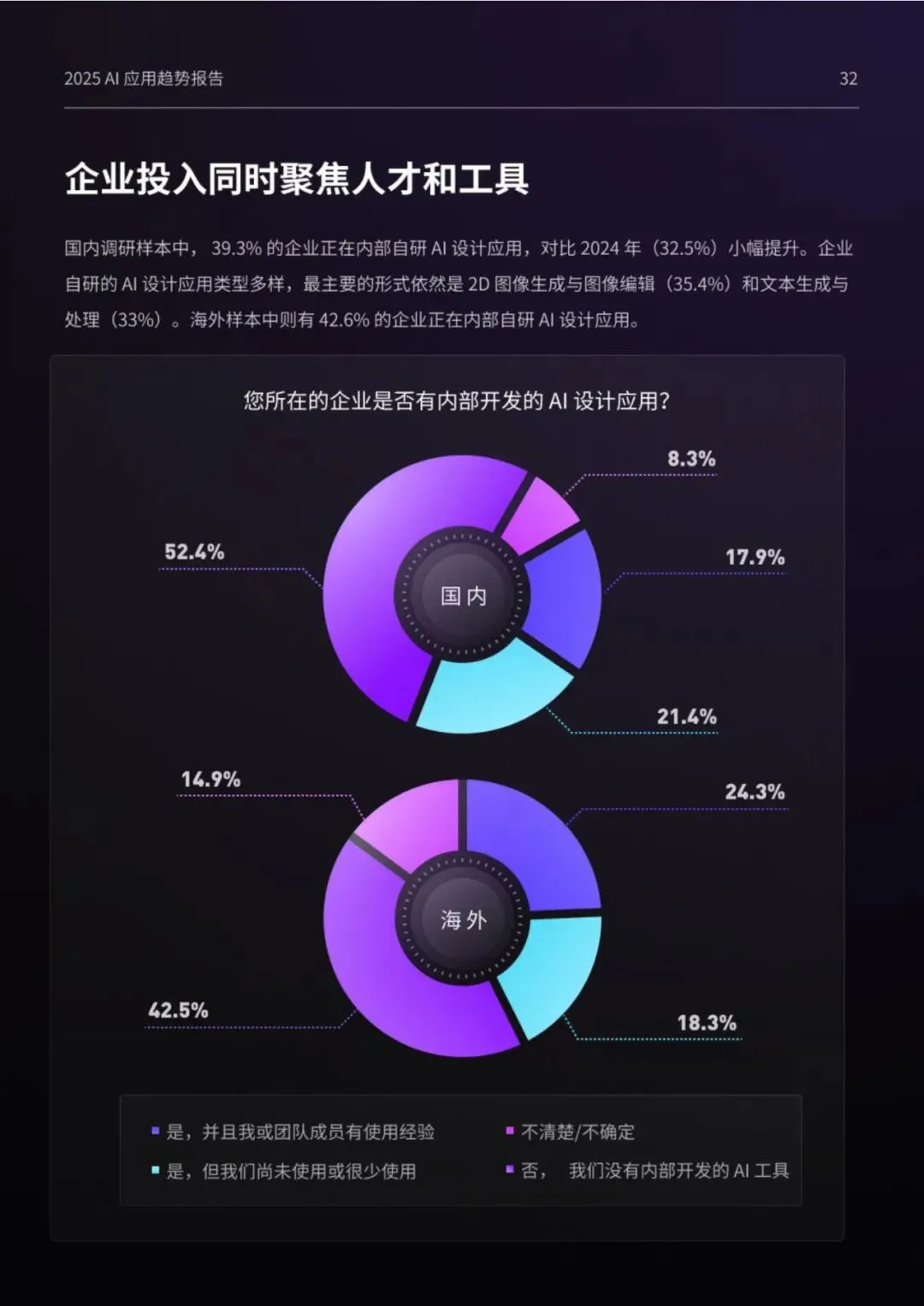2025年AI在设计行业的使用率已达85.8%,其中43.8%的受访者已在项目中使用AI辅助设计,42%正在探索学习,仅14.2%未使用任何AI工具。与2024年相比,AI应用格局发生根本性变化,用户基数快速增长,应用深度显著加强。