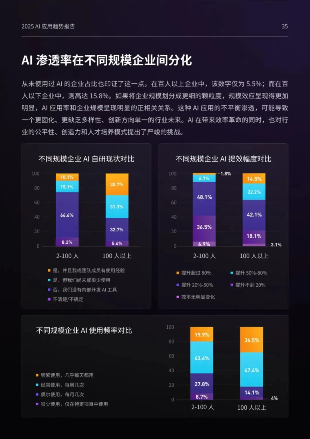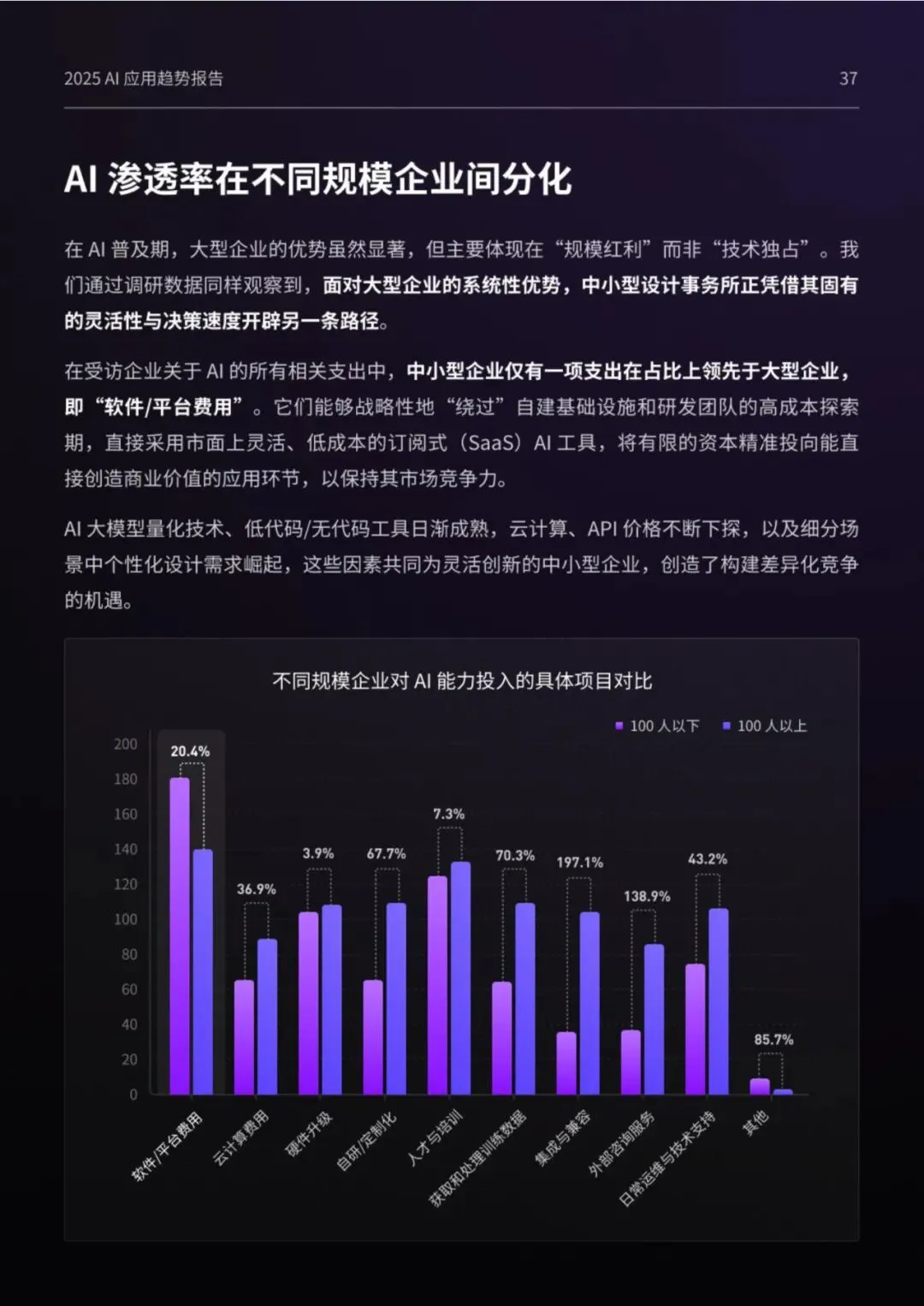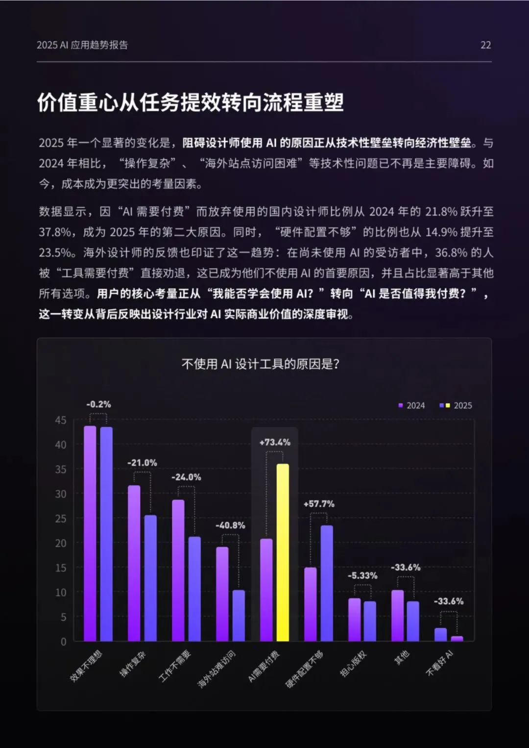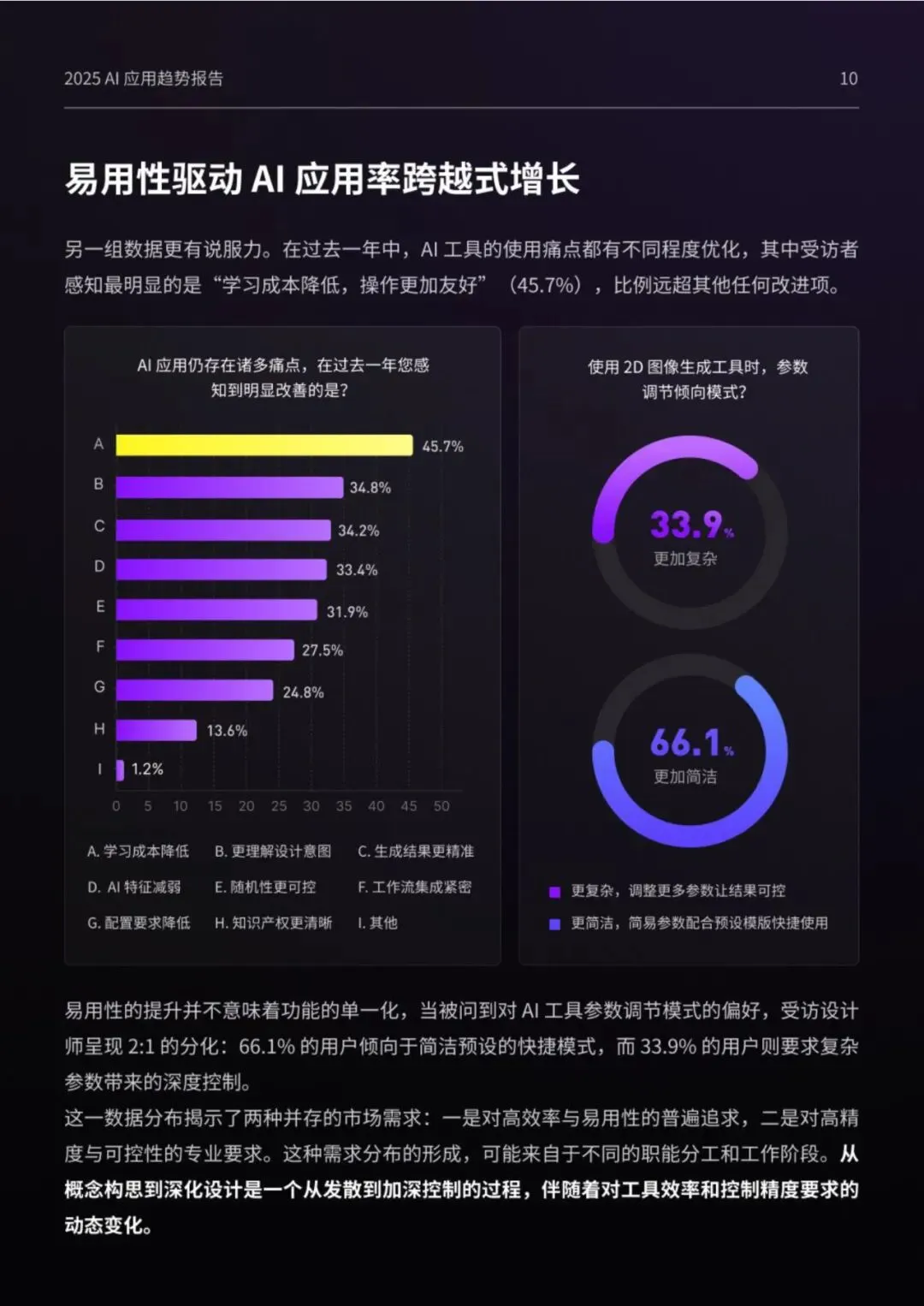报告强调,AI应用的易用性提升是推动其快速普及的关键因素。2025年,因“操作复杂”而不使用AI工具的受访者比例从2024年的31.9%下降至25.2%,同时,AI工具的学习成本降低、操作更加友好,成为过去一年中感知最明显的改进。