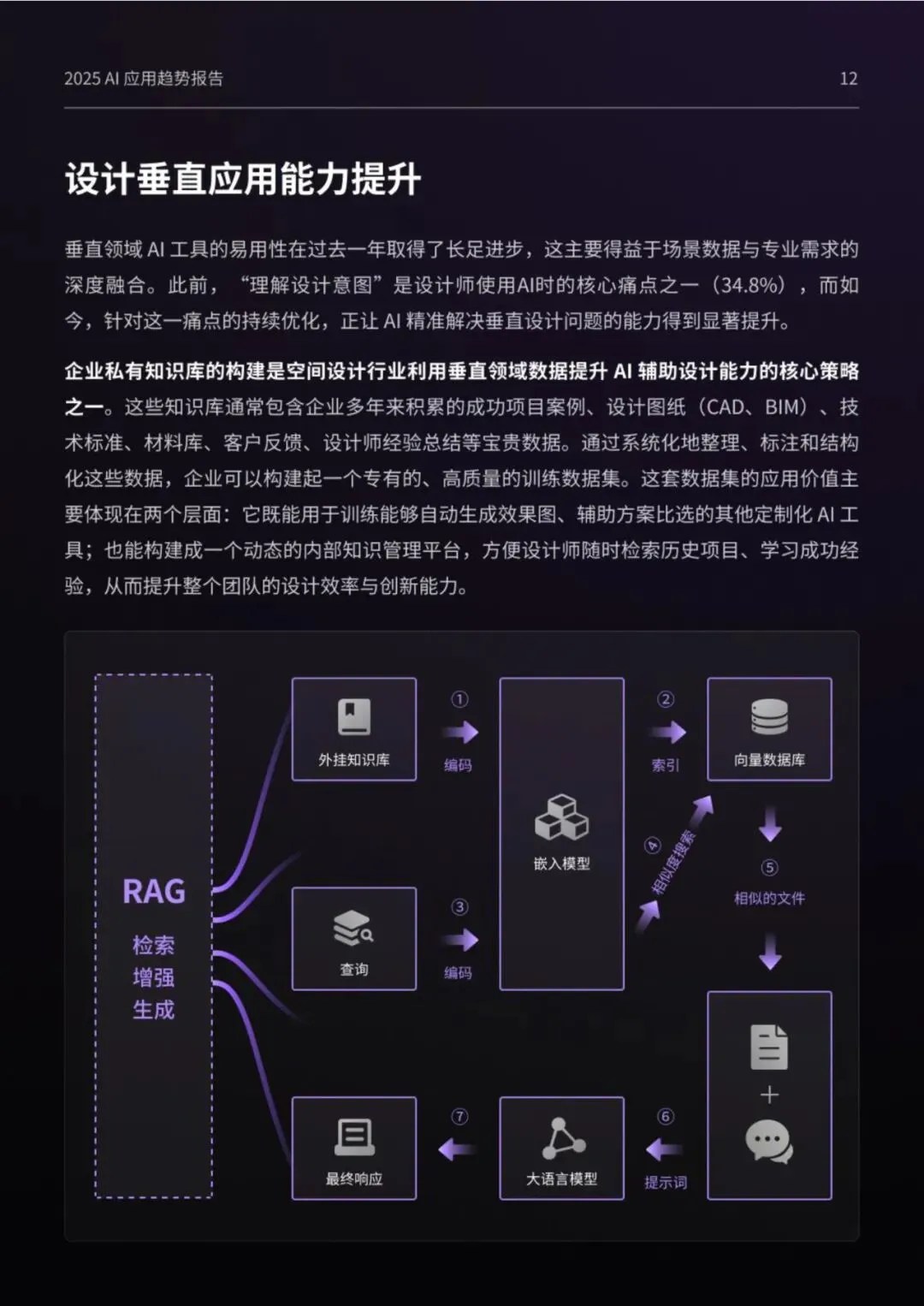 在设计垂直应用能力方面,企业通过构建私有知识库和微调预训练模型,显著提升了AI解决垂直设计问题的能力。例如,启迪设计集团通过构建领域专属知识库和部署大语言模型,实现了信息处理效率与设计辅助能力的提升。
