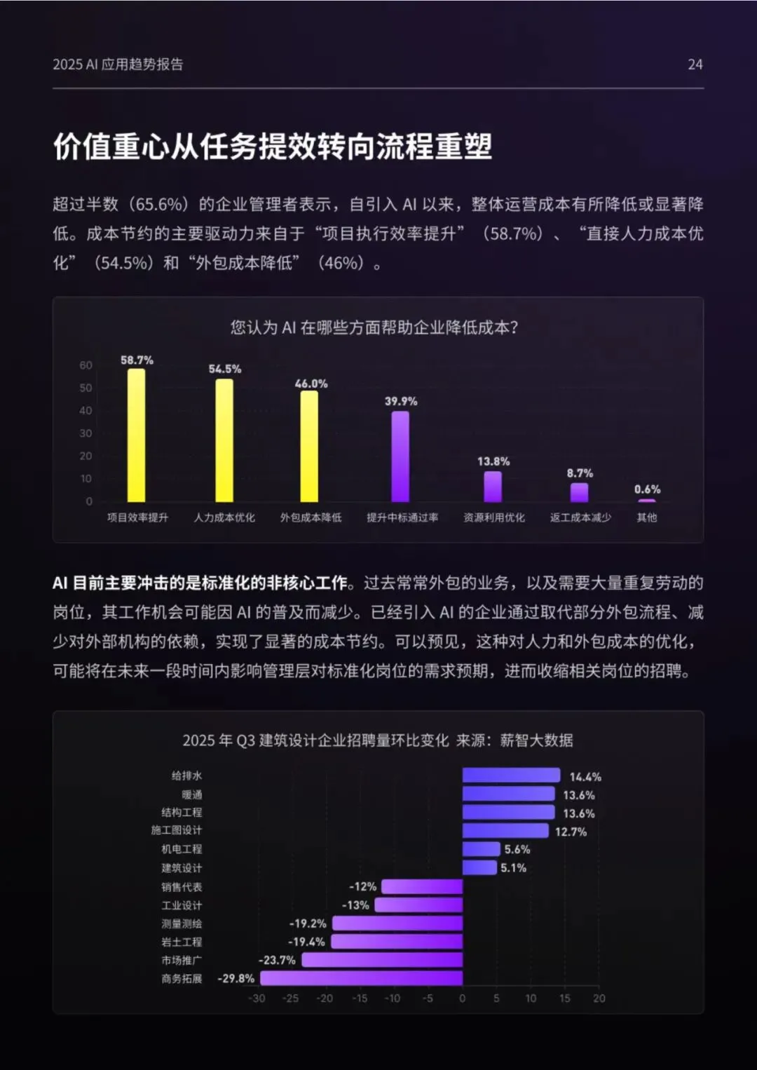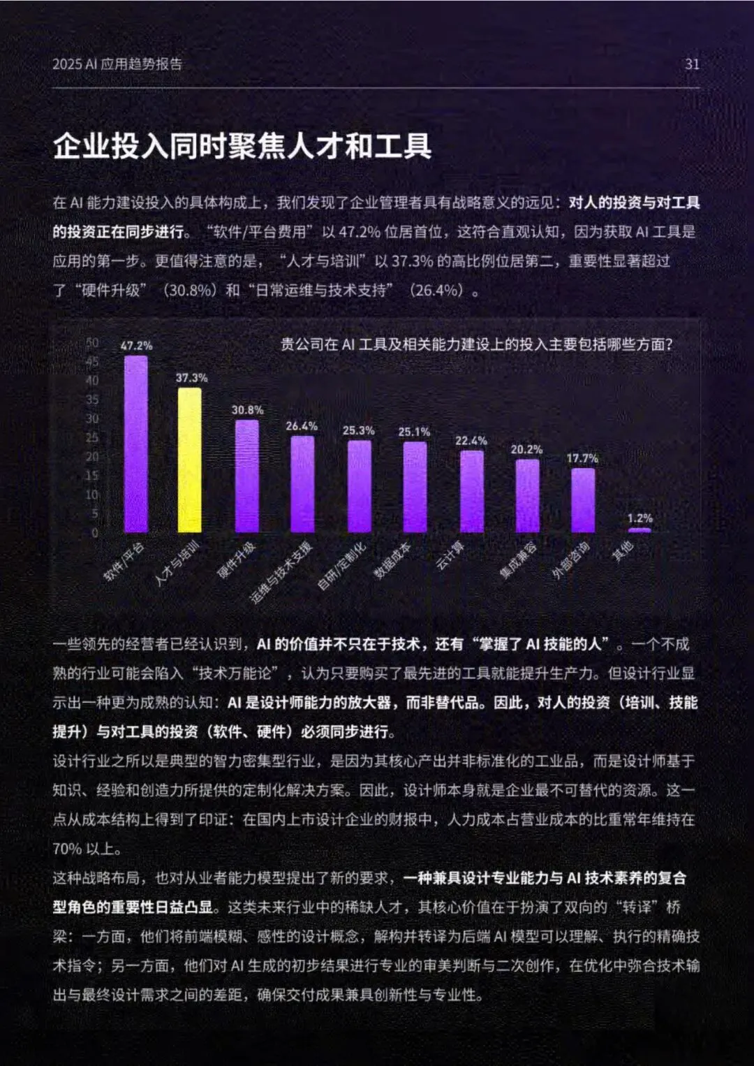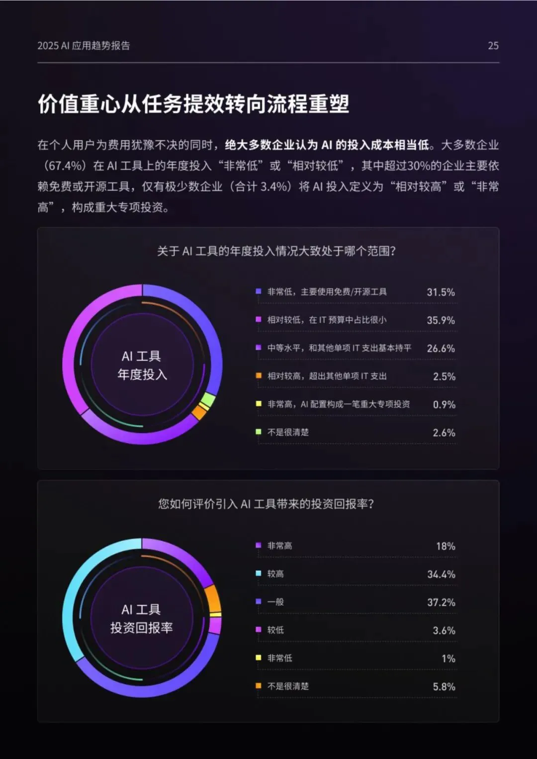 在企业层面,AI的价值重心正从任务提效转向流程重塑。企业不仅追求AI实现降本增效,更希望AI能参与更多核心环节,挖掘重塑传统流程的价值。同时,企业对AI的投入不仅聚焦于工具,也同步关注人才与培训。