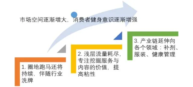 随着新增健身人群流量红利的消逝,健身行业持续盈利的着眼点在于挖掘服务与内容的价值,掌握教练资源,提高客户粘性。同时,健身产业链延伸向各个领域:营养补剂、服装、器材、健康管理、教练培训等。