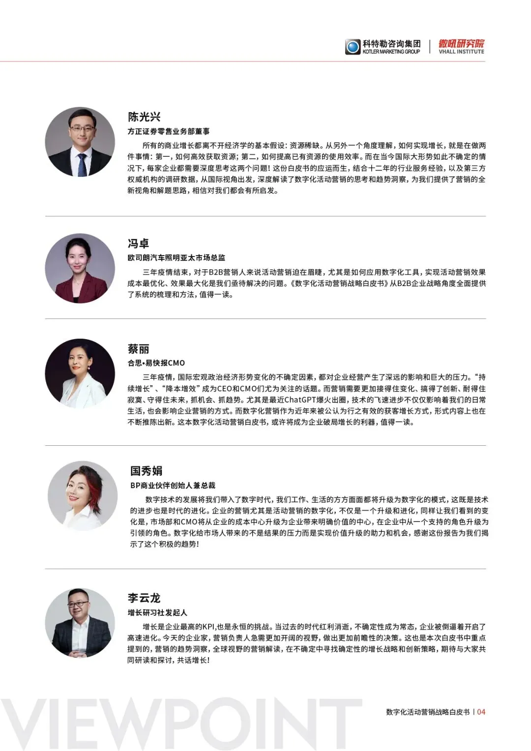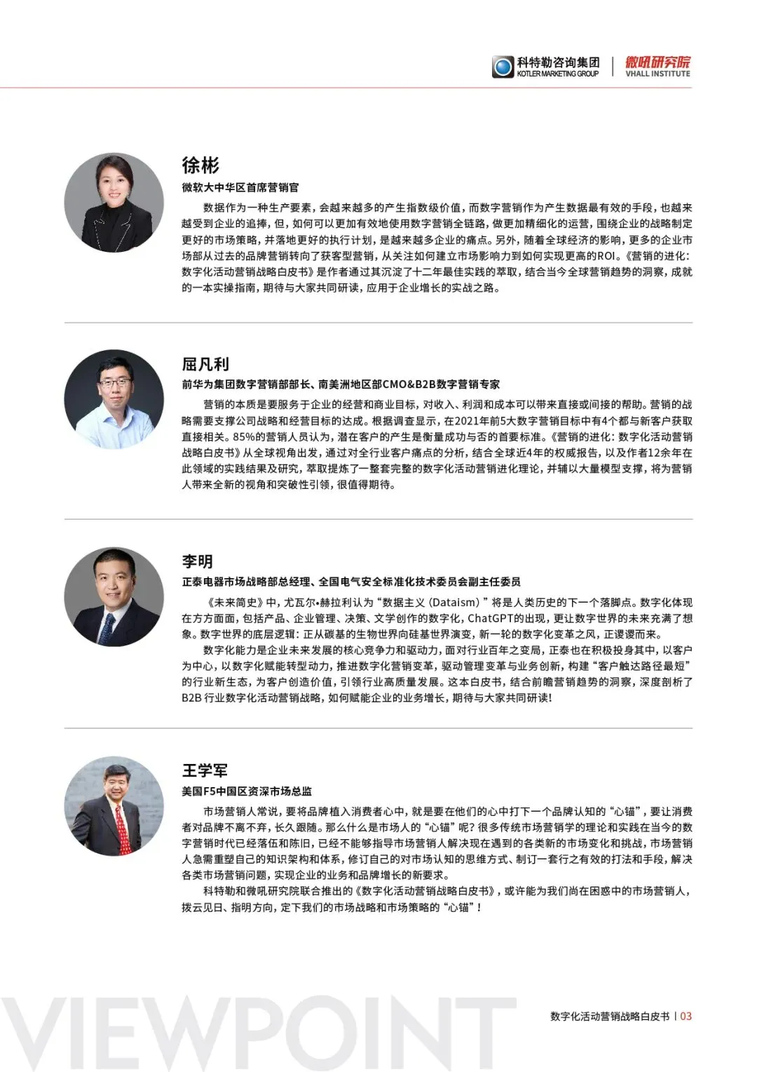 华为-数字营销部部长、腾讯CSIG-市场副总裁、京东数科-市场负责人、支付宝B端-市场负责人、Google-大中华区及韩国营销平台总经理、微软(中国)-首席技术顾问、SAP-全球产品营销总监、IBM-数字营销总监、Slack-全球数字营销负责人、巨量引擎-市场总经理、广联达-上海总经理、视源股份-高级副总裁、明略科技-营销科学家、科大讯飞-市场副总裁、飞书多维表格-负责人、致趣百川-CEO、火眼云-CEO、滴滴-企业级总经理、科特勒咨询-全球合伙人、兔展-CEO、微盛-CEO、络享云-CEO、薪人薪事-CEO、明道云-CEO、Ping++-CEO,保利威-CEO、上海雍熙-CEO、领健Linkedcare-CEO、云客-CEO、红海云-CEO、品览-CEO、行李管家 -CEO,慧结算-CEO、传声营销-CEO、E企行-CEO、纷享销客-联合创始人、易法客-联合创始人、阔知-联合创始人、蘑菇租房-联合创始人、银云信息-联合创始人、致趣百川-CMO 、甲骨文营销云-CMO、京东数科-CMO、火石创造-CMO,石墨文档-CMO、云学堂-CMO、致趣百川-SVP,网易智慧企业部-CMO、亚布力企业家论坛-CMO、侣程科技-CMO、聆通助听-CMO,华润创业-投资副总裁、北森-市场副总裁 ,神策数据-市场副总裁、销售易-市场副总裁、六度EC-市场副总裁、极光科技-市场副总裁、红圈营销-市场副总裁、分贝通-市场副总裁、谷川联行-副总裁、乐言科技-副总裁、智慧芽-市场副总裁、环信-市场副总裁