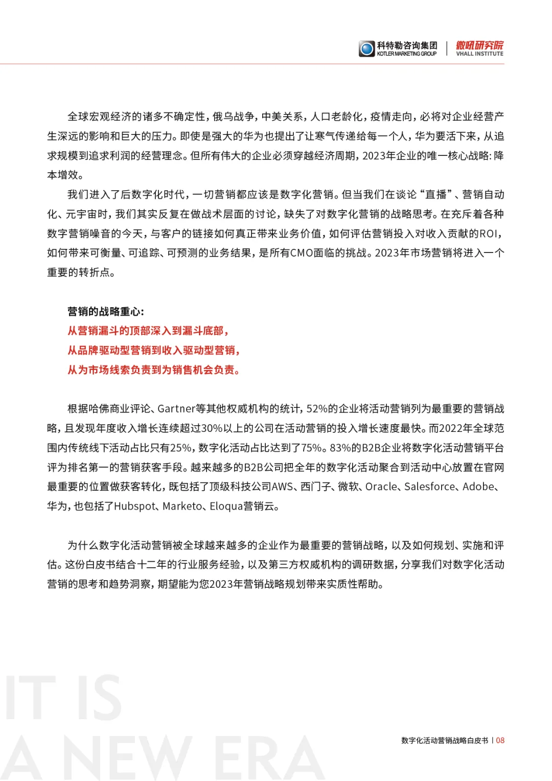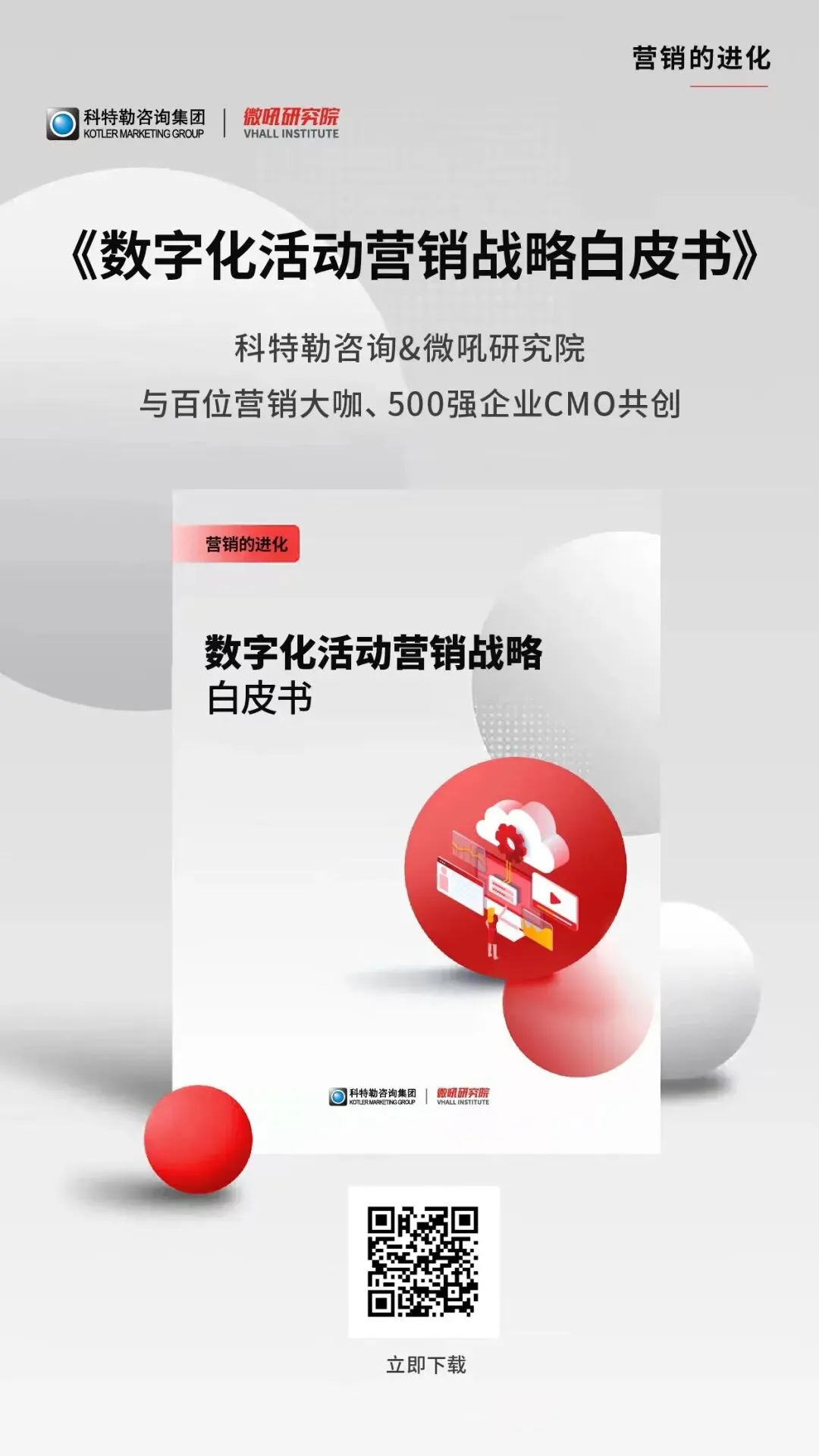 微吼研究院联合全球首席营销机构科特勒咨询,以及百位营销大咖、500强企业CMO对数字化活动营销的应用实践和趋势洞察,输出《营销的进化:数字化活动营销战略白皮书》,期望能为更多企业2023年战略规划带来实质性帮助和启发。