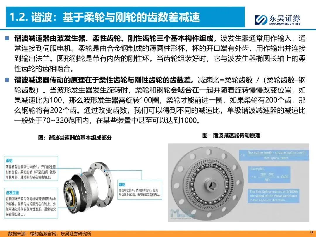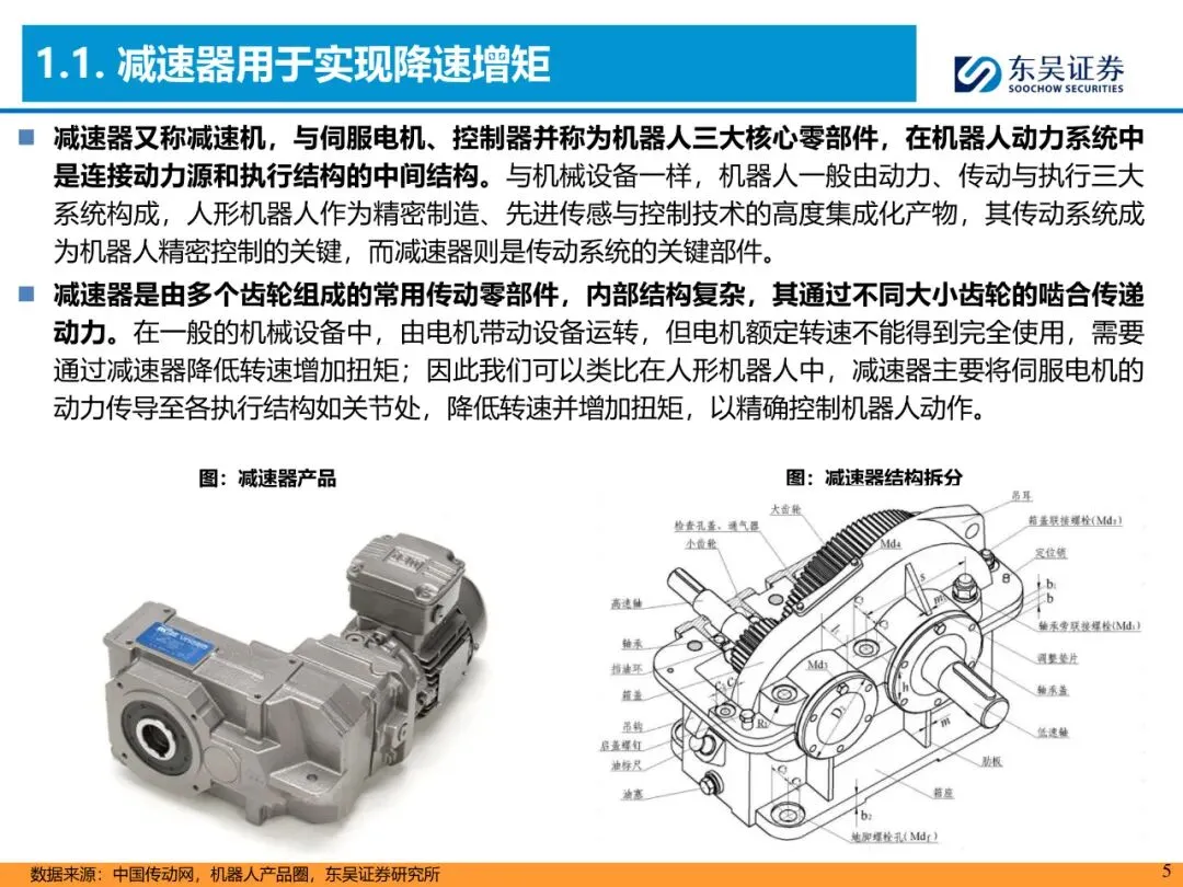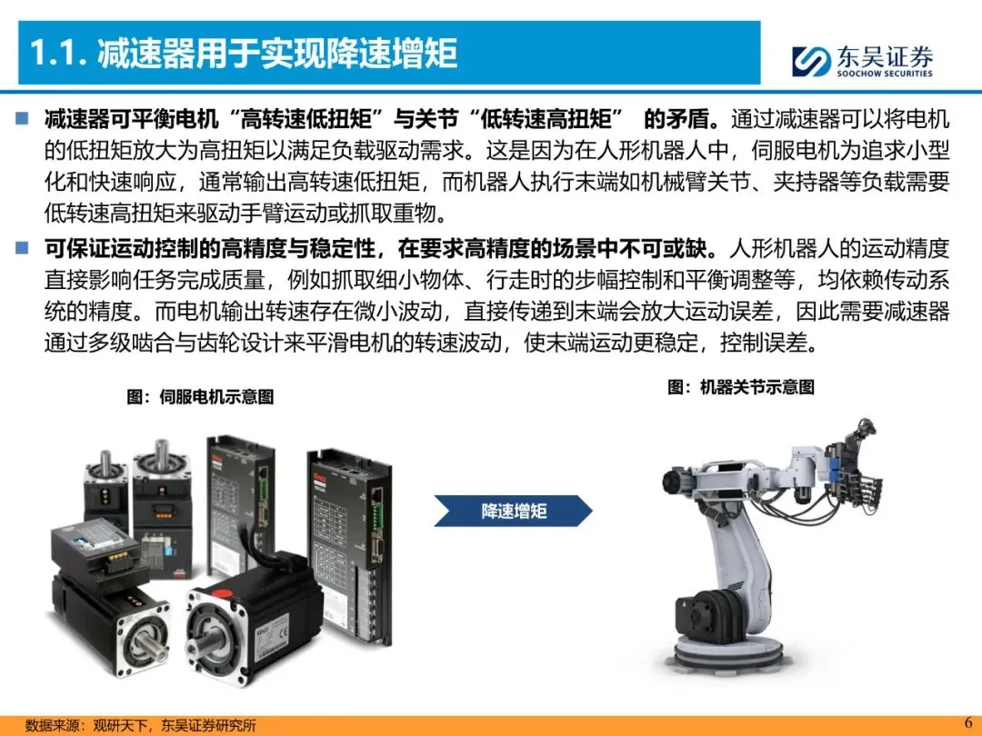 1. 功能:把伺服电机“高转速低扭矩”转化为关节“低转速高扭矩”,并平滑转速波动,控制误差<0.01°。