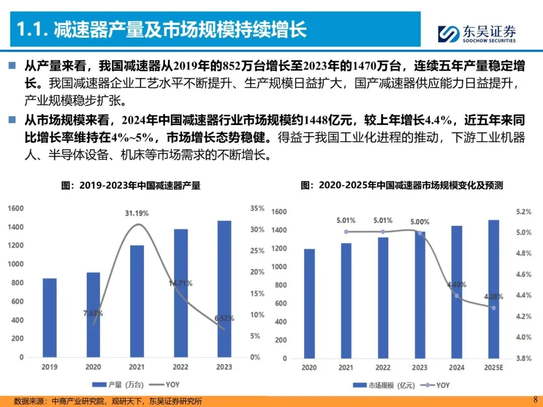 3. 双环传动:子公司环动科技国内RV市占率18%,2024年净利10.24亿元,同比+25%;已量产CSF/SHF谐波与RV全系列,负载覆盖3-1000kg。