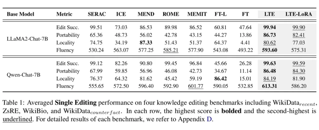 在四个主流知识编辑数据集上,LTE 方法在两个不同的大模型上均取得了优于基线的效果,展示了其在增强知识编辑能力方面的有效性,同时对大模型通用能力的干扰最小。