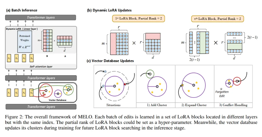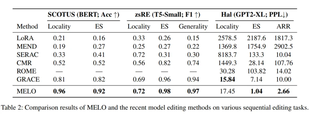 目前的大模型知识编辑方法在持续知识编辑场景无法同时兼顾所有评估指标(Edit Success,Locality,Generality,Sequential Editing,Efficiency)的性能。本文提出一种新方法 MELO,该方法通过动态激活 LoRA 块来编辑模型,并且采用了非重叠的 LoRA 块进行训练,缓解了之前知识编辑中存在的灾难性遗忘问题。