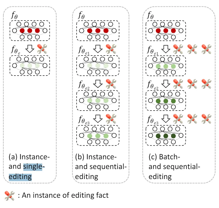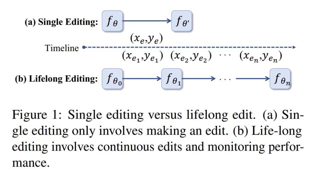 以往的方法主要关注单次编辑(如下图(a)所示),本文致力于解决持续知识编辑(如下图(b)所示)。