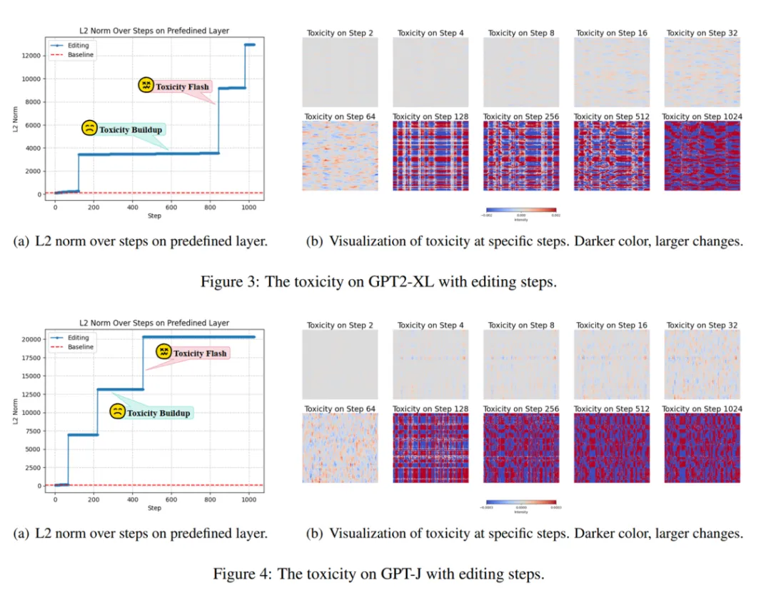 以往的方法经过在持续知识编辑的设置下会引发巨大的副作用(本文称为毒性),如下图所示: