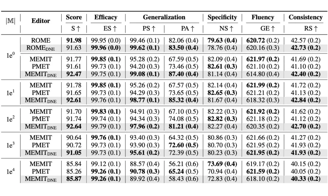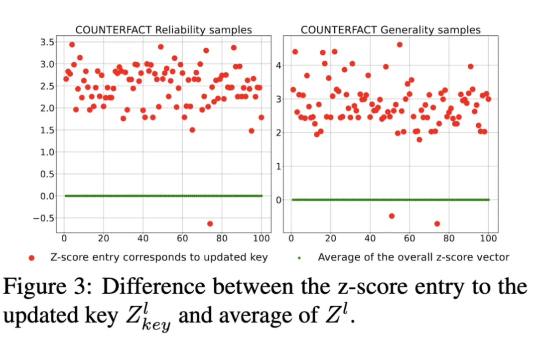 该方法使用一个新设计的变换器内存更新机制,以及一个简单但有效的局部编辑范围识别技术,用于钩子层中精确检测输入的局部编辑范围。如下图所示,几乎所有来自更新密钥的响应的 z 分数都与平均值有很大差距,可靠性样本中最低约为 1.5,一般性样本中最低为 2。