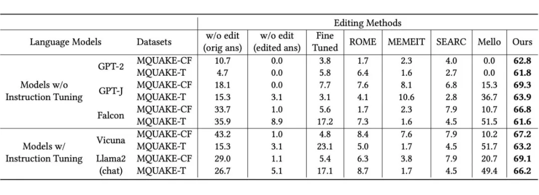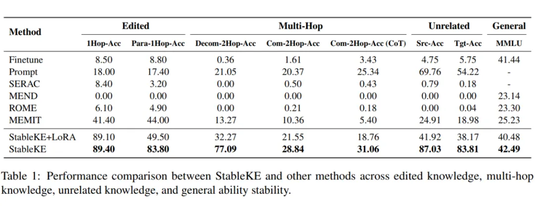 实验结果表明 StableKE 超越了其他知识编辑方法,展示了编辑知识和多跳知识的稳定性,同时还保留了不相关的知识和通用能力。此外,StableKE 可以编辑 ChatGPT 上的知识。